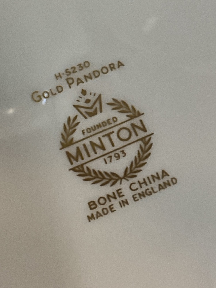 Service for 12 Minton Gold Pandora China. Service for twelve plus extras. Serving pieces including large covered tureen, sugar and creamer etc. As seen in photograph preview.