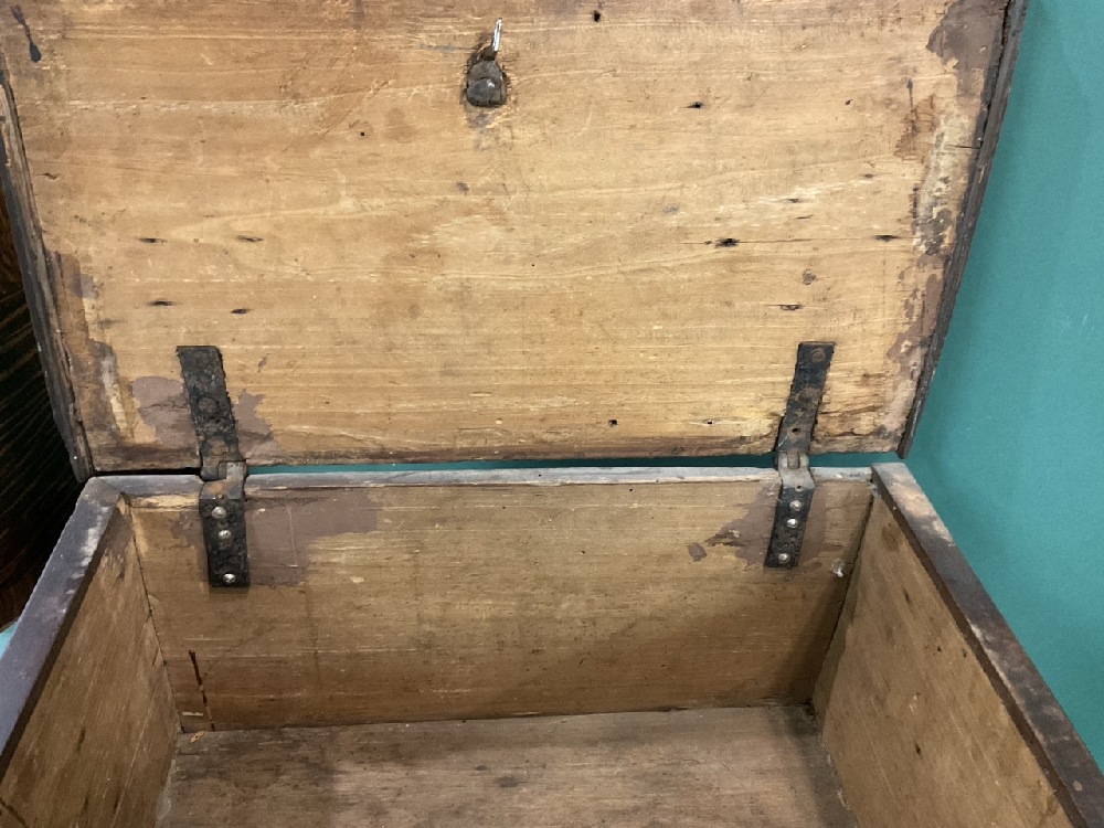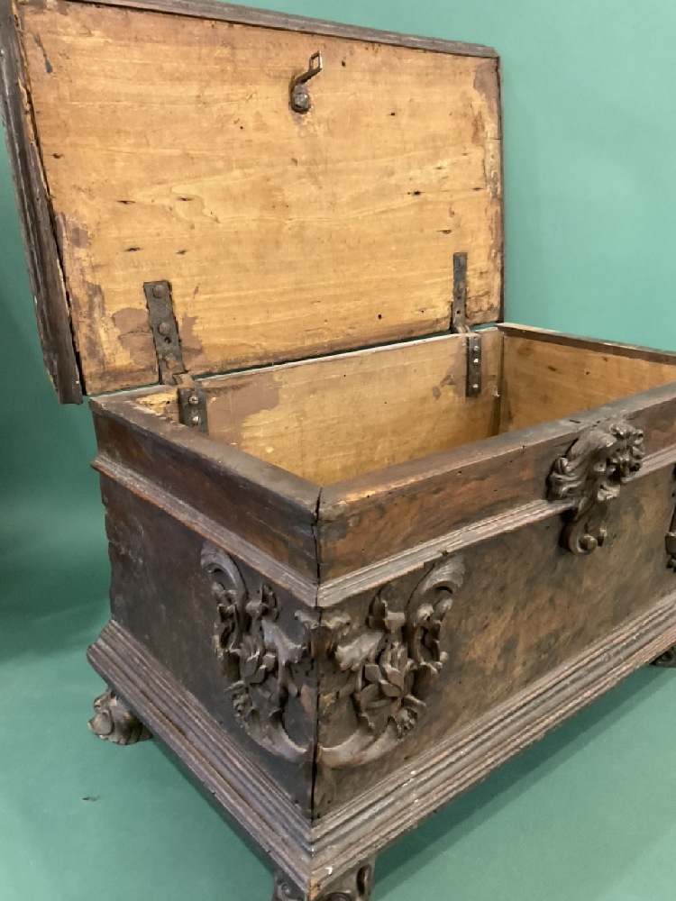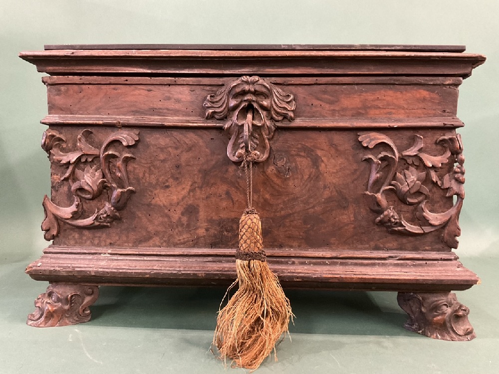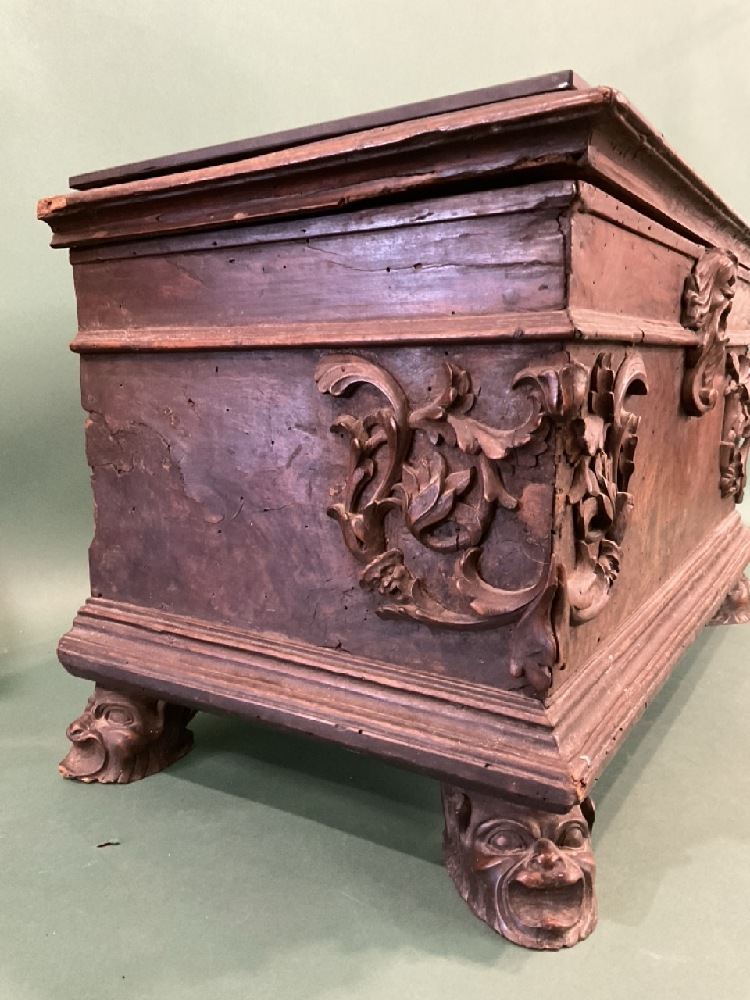 18th century Italian Carved Walnet Chest. A contemporary black glass slab added to the top for accent. Key included. Dimensions: 13 3/4” x 22 1/2” x 12”