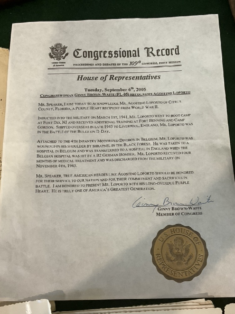 Owned by Augustino LoPorto, wounded in action brother Thomas Loporto killed in action and brother Augustino Inzerria not injured. All three were in the same Platoon 4th Infantry Battle of The Bulge out of Camp Upton, New York.