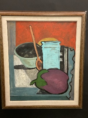 Carolyn Haeberlin (American, 1923-2000) Titled: Eggplant (Still life Kitchen Table Top) Oil on canvas. Dated Dimensions: 23” x 18” and 29” x 25”