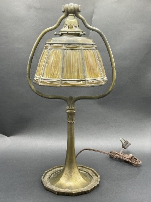 Tiffany Studios table lamp with 10 linen fold panels. Shade has damage, base plate to bottom of lamp is missing, all electrical needs replacing. Lamp shade is signed Tiffany Studios, New York. Dimensions: 20”h x 7 1/2” gala and 9” with harp