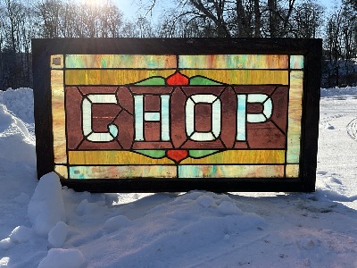 Stained Glass Transom Window “CHOP” Housed in a hardwood frame. Condition - Paint chipping on frame. Dimensions:19 1/2” x 35 1/2” x1 1/2” Inv. 170