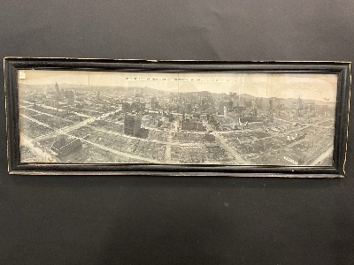 Complete View of Fire-Swept San Francisco’s Six Square Miles of Ruins April 18, 1906. A panoramic original photograph image. Condition: Water Staining. Dimensions: 15” x 43” Framed.