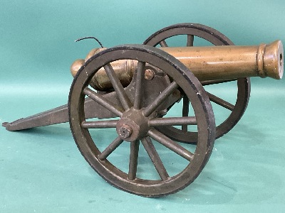 Antique Brass Cannon. Dimensions: 16” Overall, 7 1/2” wheels, 11 1/2” Tube 1/2” Bore All The Way, No Touch Hole. 14lbs.