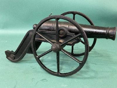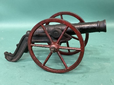 Cast Iron J and E Steven’s Toy Cannon. Dimensions: 15” L, 11” Tube, 7” Wheels