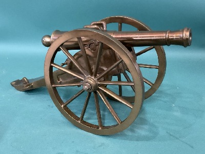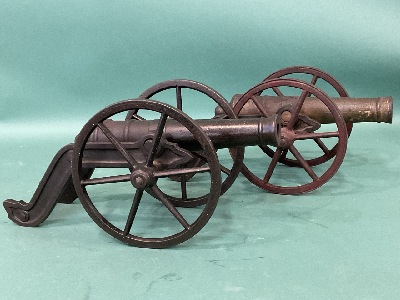 Small 19th C Breech Loading Bronze Model Cannon. Tube 7 1/2” 11” overall with carriage, 5 1/2” Iron Wheels. Weight 5 lbs.