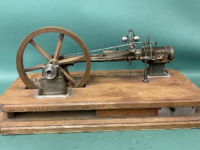 Vintage Model Steam Engine Bronze Frame and Flywheel on Wood Base . Dimensions: 9” Fly wheel, Base is 24 1/2” x 12 1/2” weight: 30lbs.