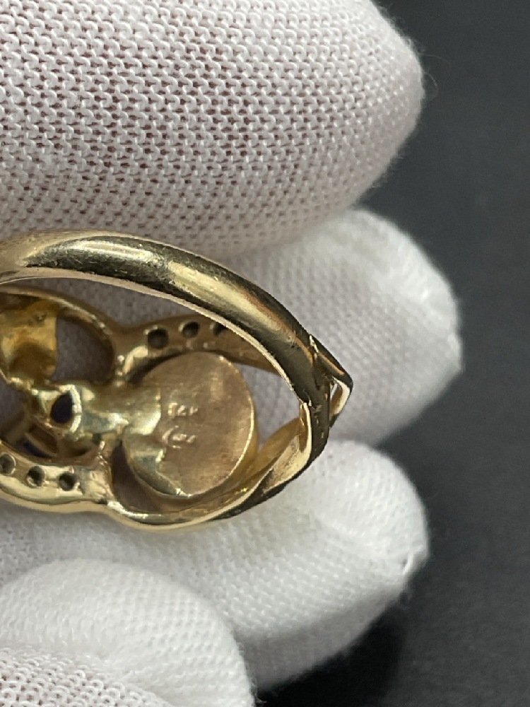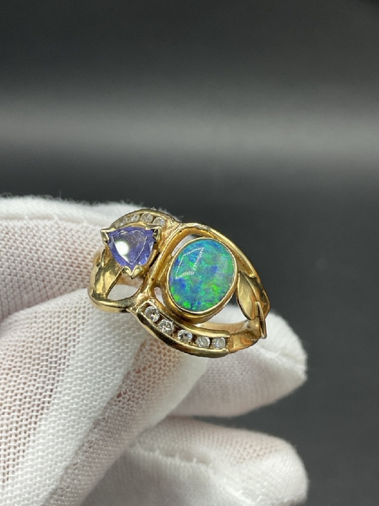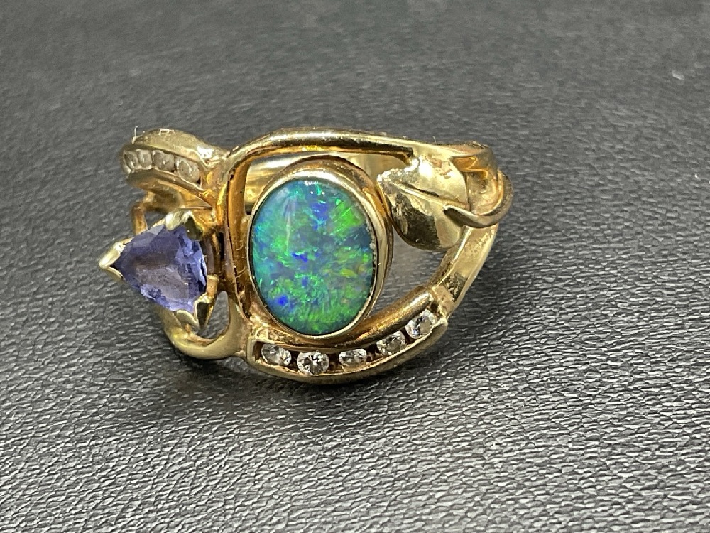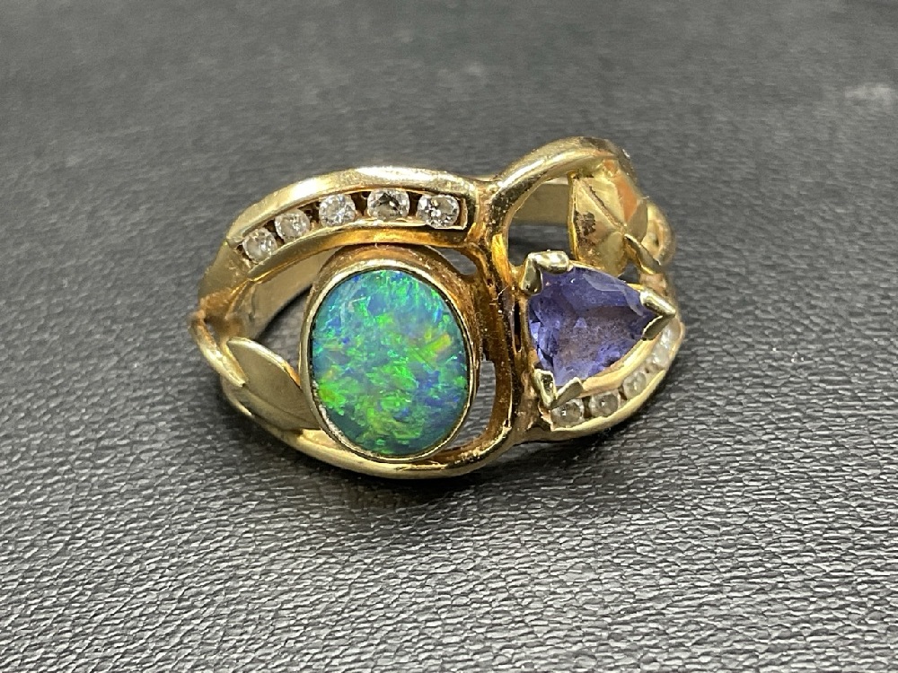 14K Yellow Gold Opal, Tanzanite and Diamond Ring.
