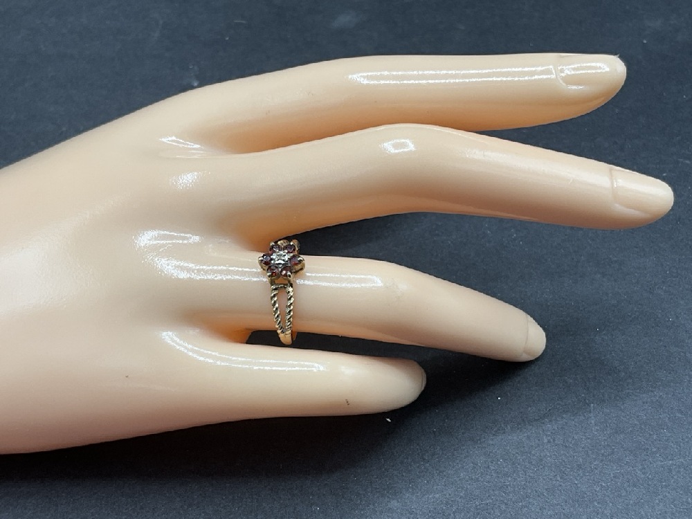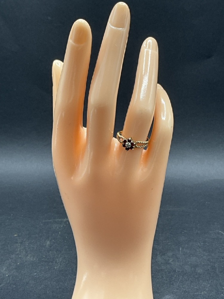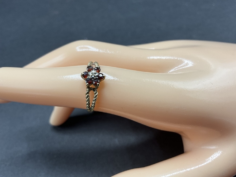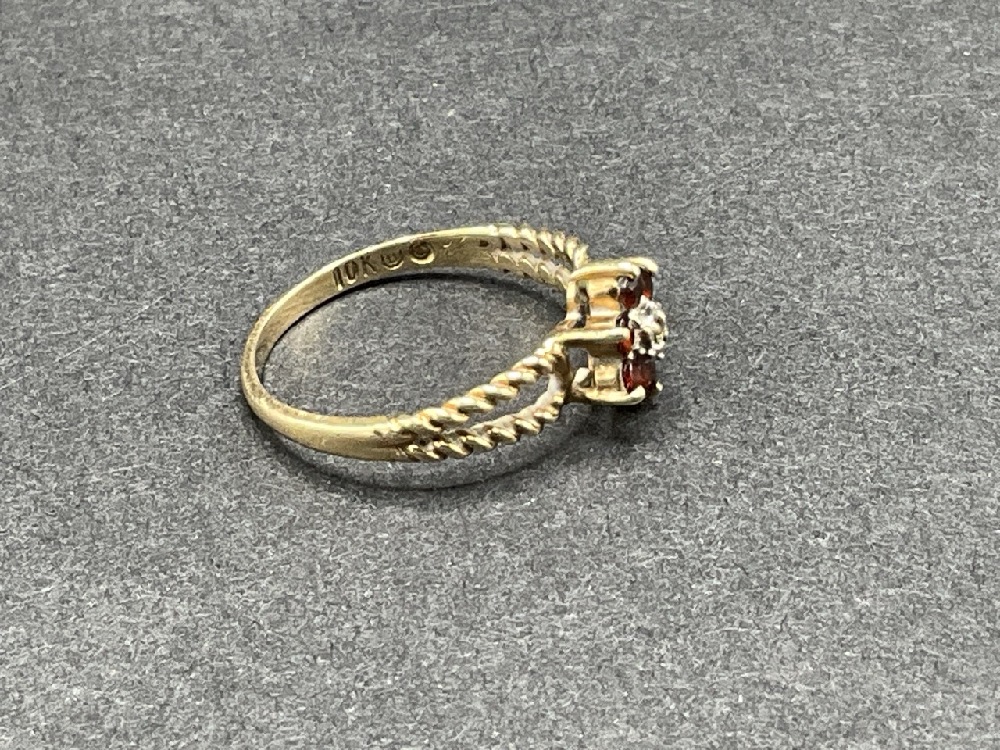 10K Yellow Gold Garnet and Diamond Ring. Size 5. Total Weight 1.6 grams.