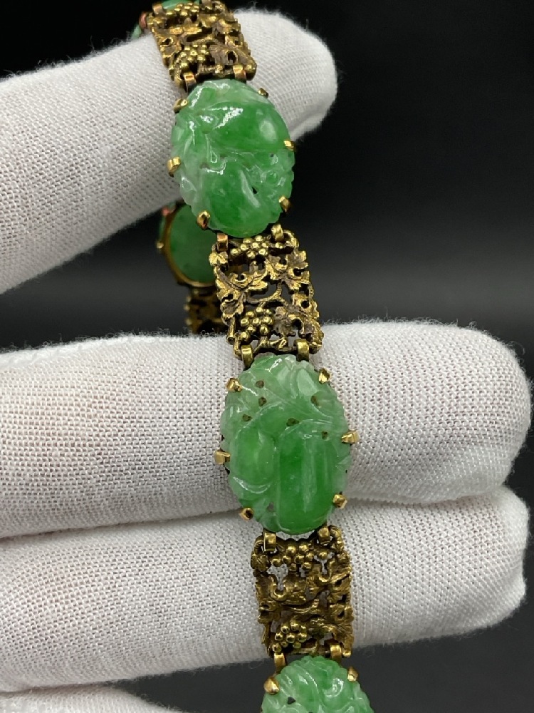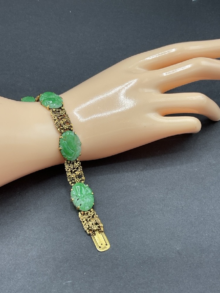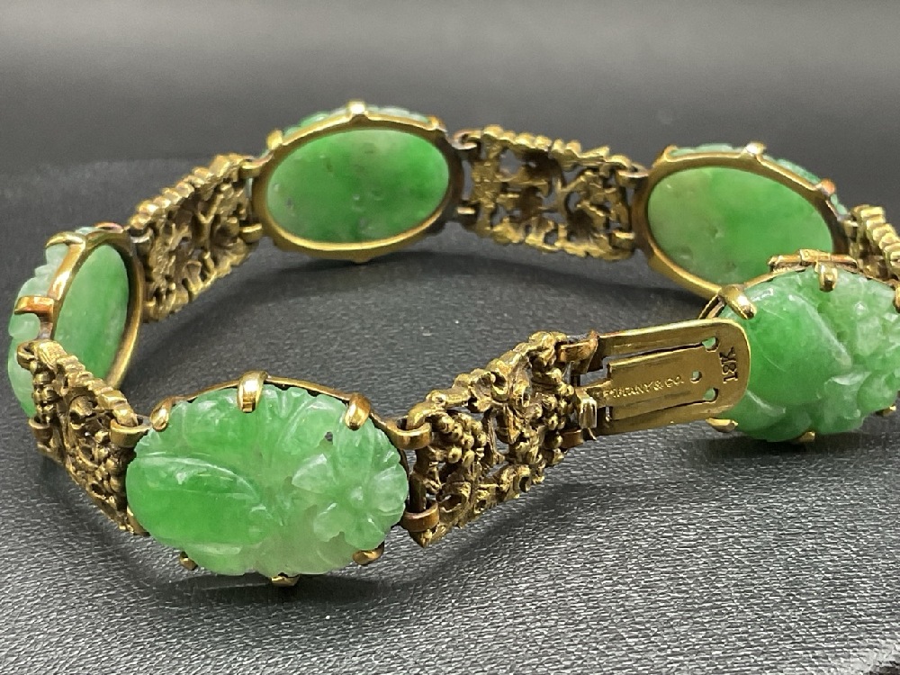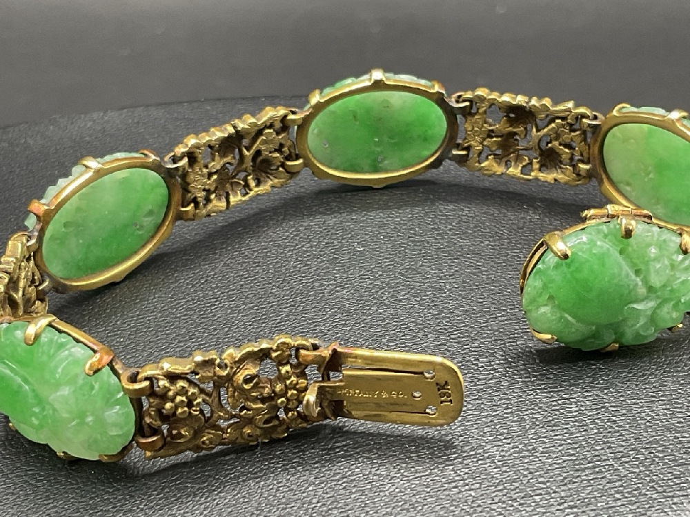 Vintage Tiffany and Co. 18K Yellow Gold Carved Chinese Jade Bracelet.