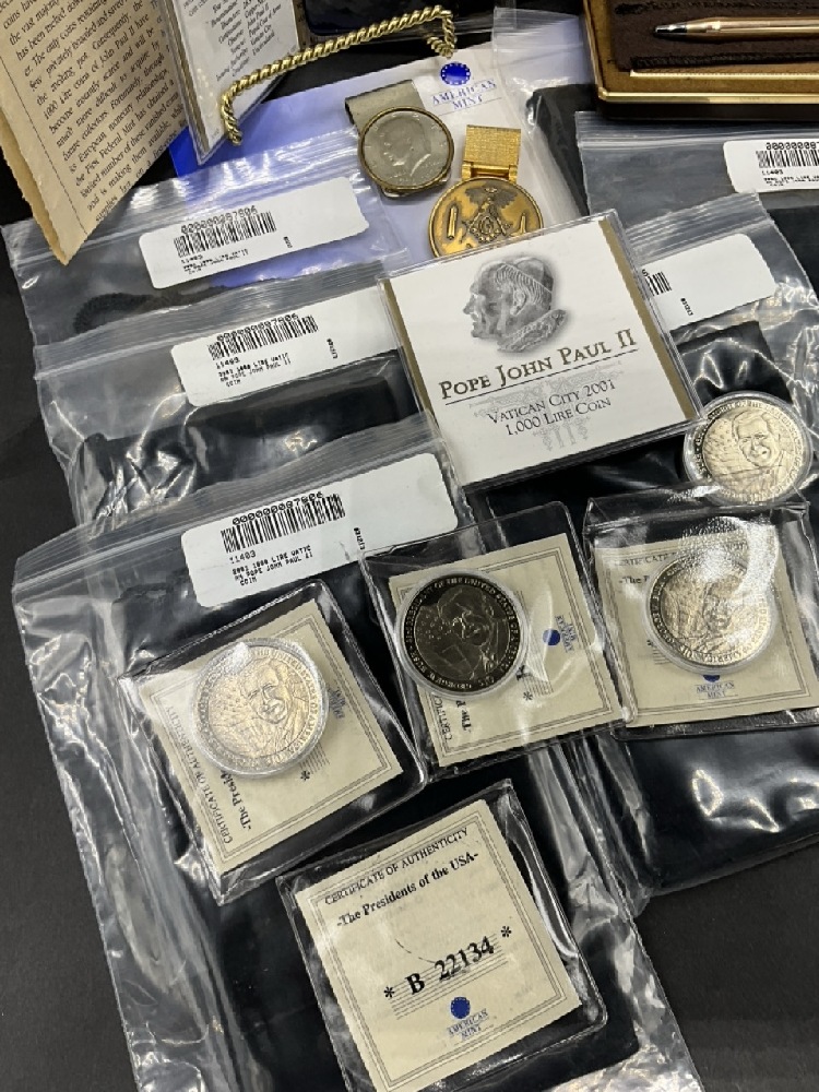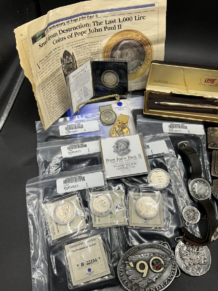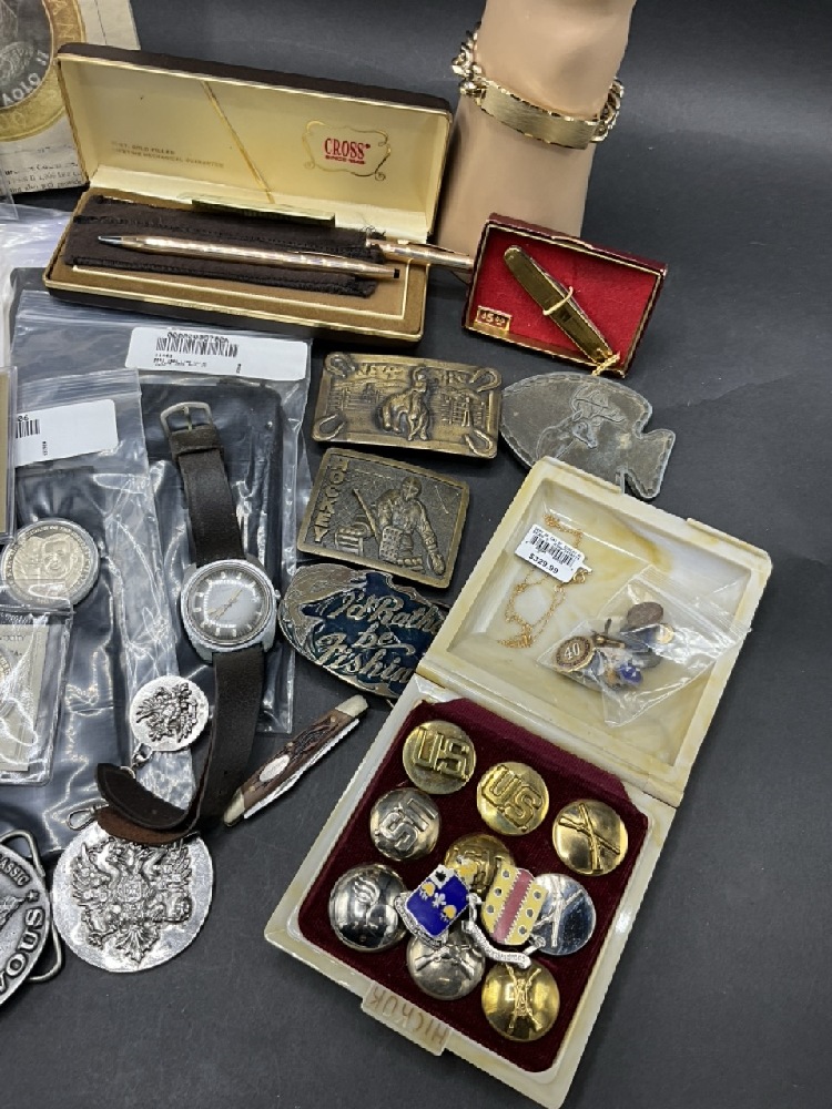 Men’s Lot - Coins, Belt Buckles, 14KT Gold Filled Cross Pen Lot, Military Pins.