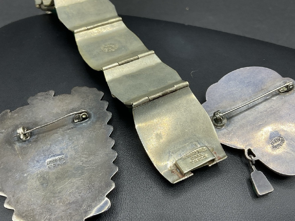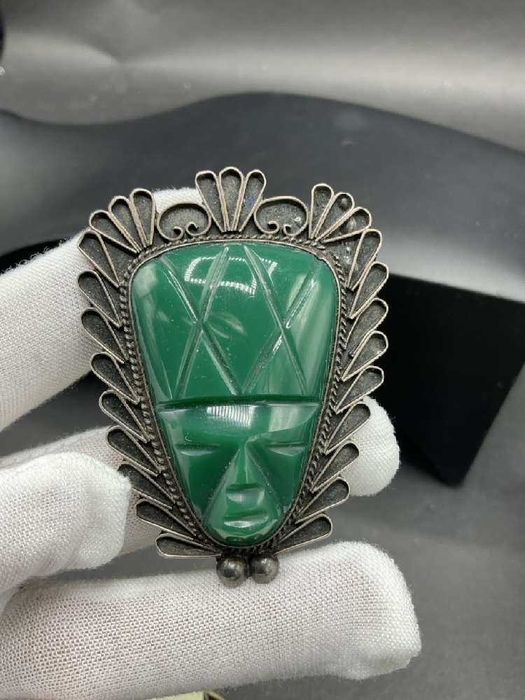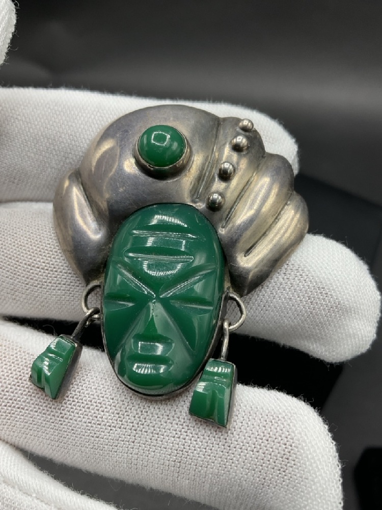 Mexican, Taxco Sterling Silver Bracelet and Brooches with Green Onyx Carved Stone Faces.