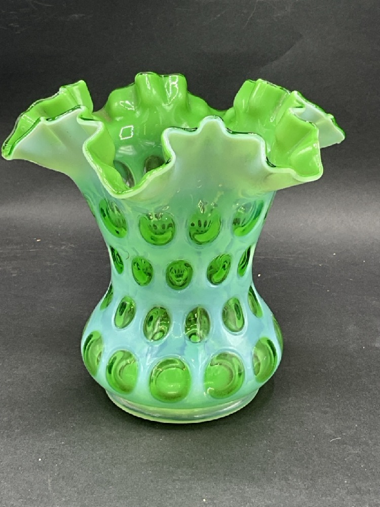 Vintage Fenton Green Coin Spot Glass Ruffled Vase