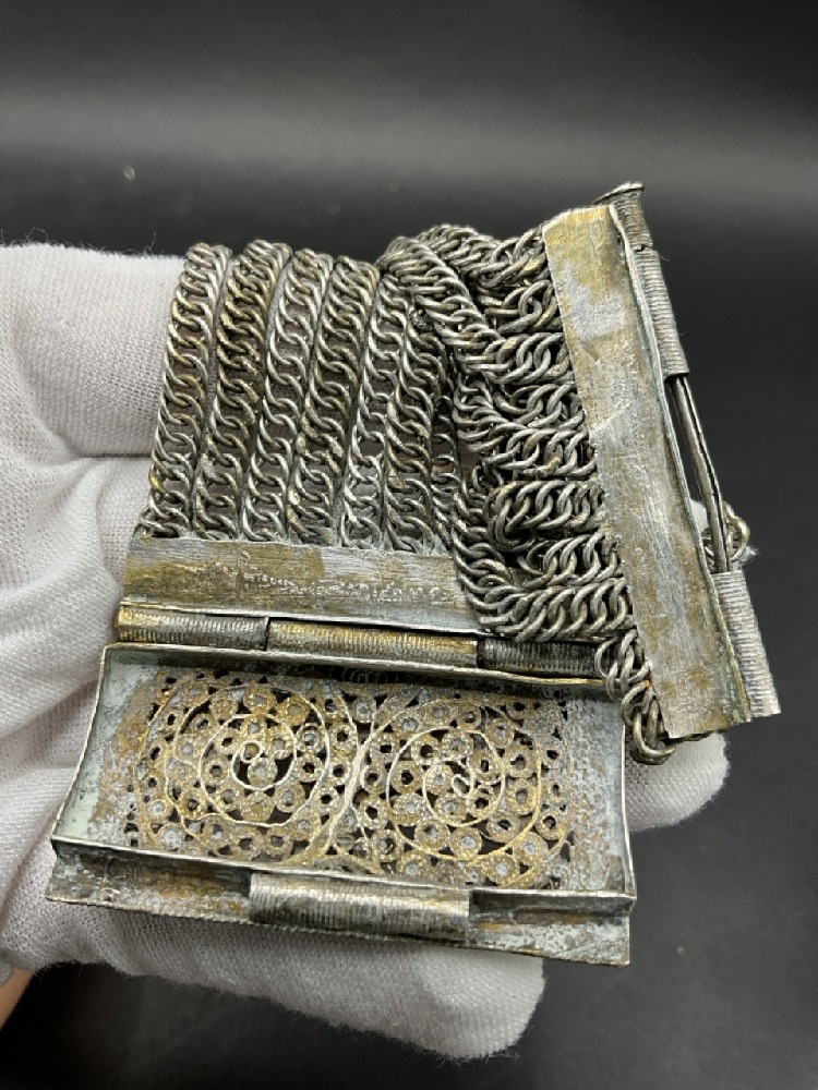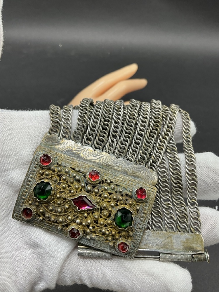 Vintage Silver Toned Jeweler Bracelet. Ruby and Emerald Colored Glass Stones.