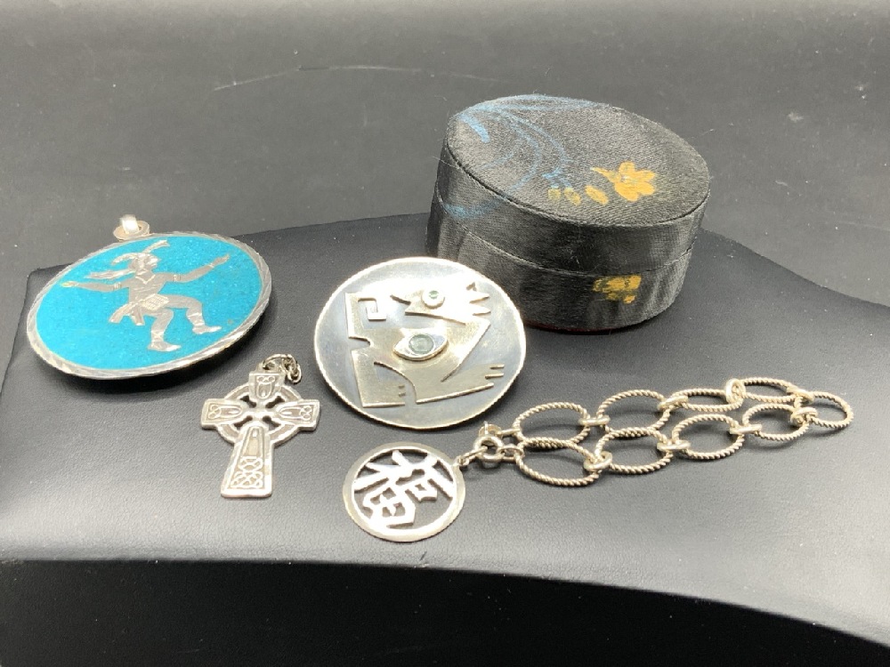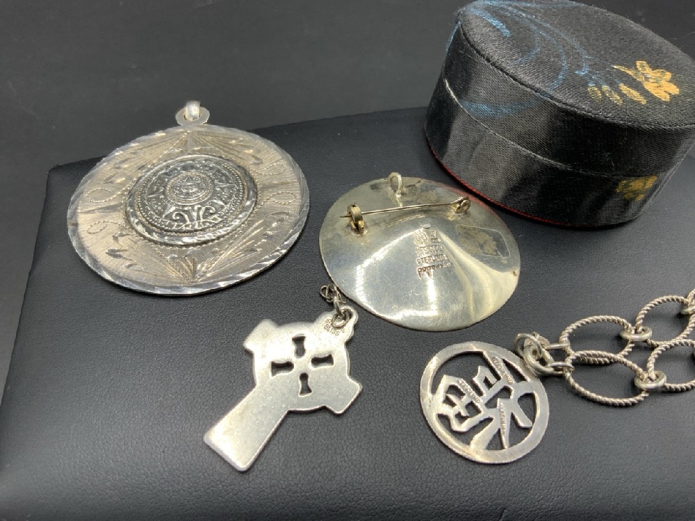 Sterling Silver Jewelry with Mechben Mexican Popwski, Double Sided Aztec Warrior /Mayan Sun Calendar Pendant and Chinese Necklace/Pendant.