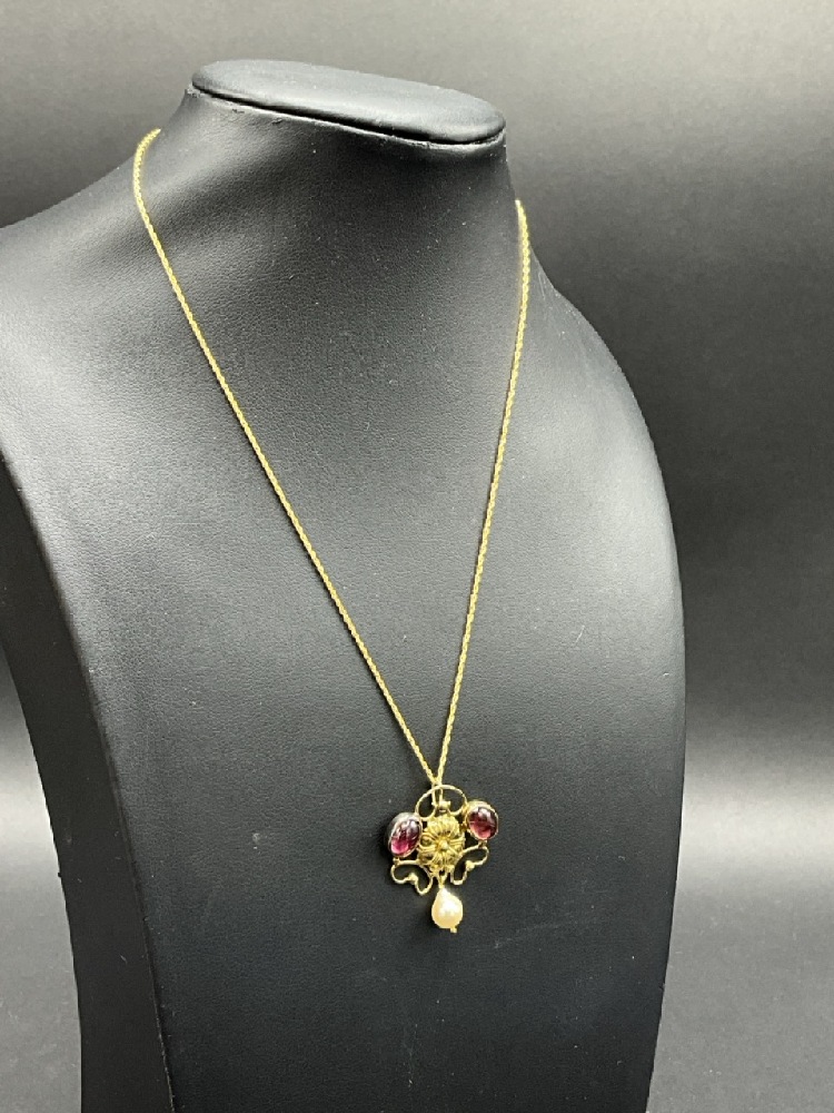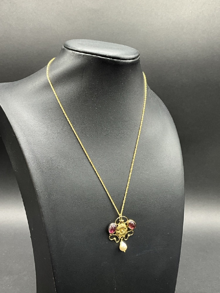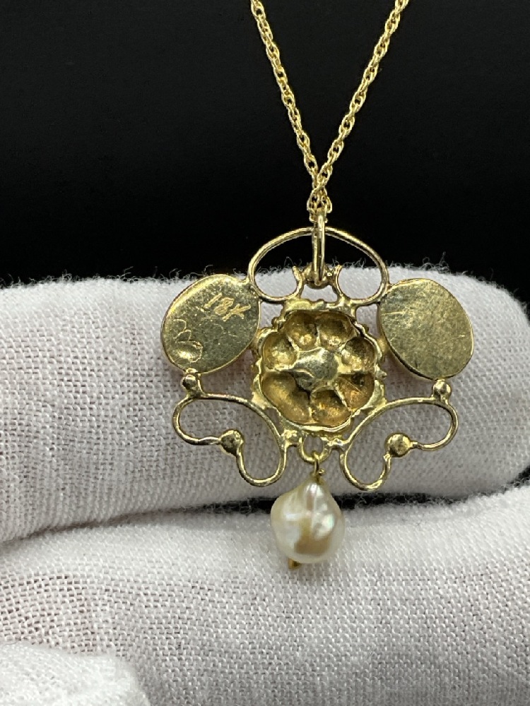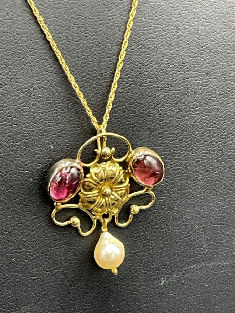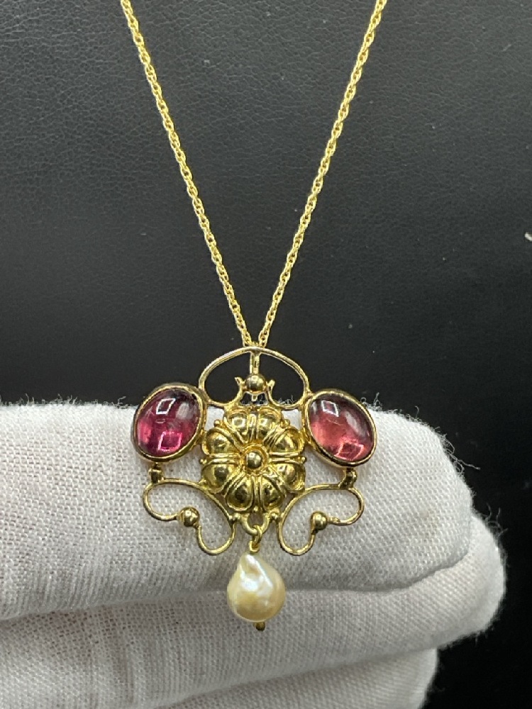 18K Art Nouveau Style Yellow Gold Flower Design Lavolier with Two (2) Oval Cabochon Natural Pink Tourmaline and One 6mm Cultured Pearl Drop and a 15" 14K Yellow Gold Rope Chain.