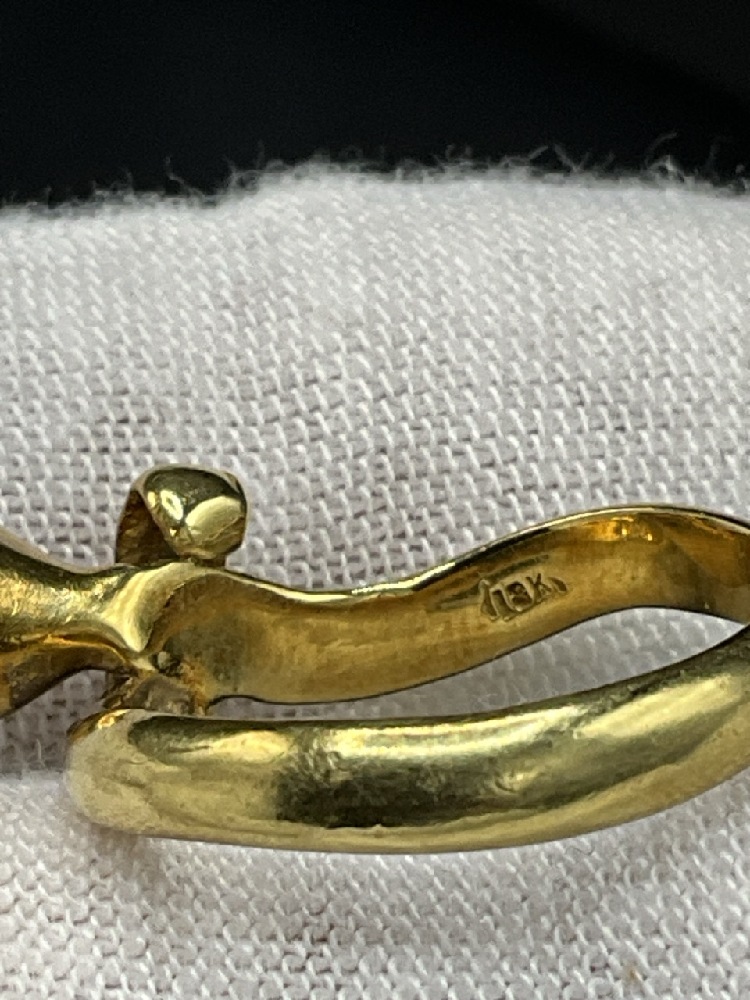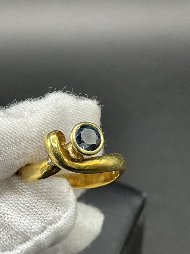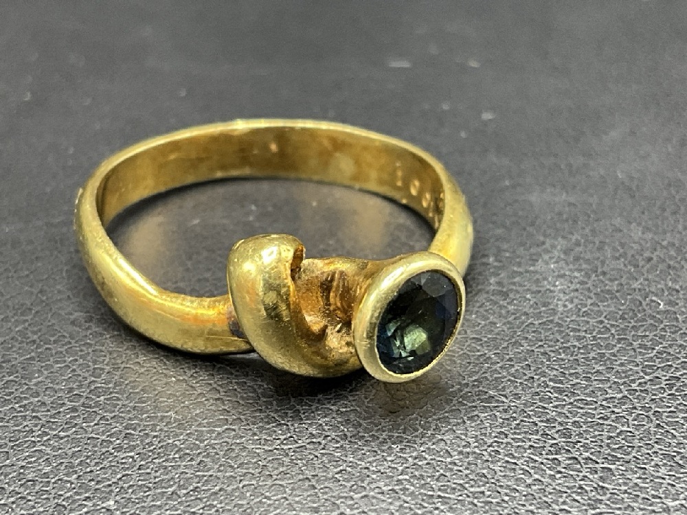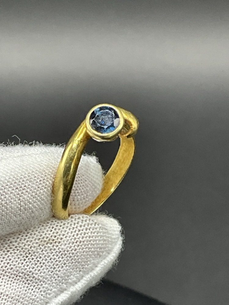18K Lady's Handmade Blue Sapphire Ring. One approximately 5mm round brilliant cut natural dark blue sapphire. The ring is stamped 18K 41001.