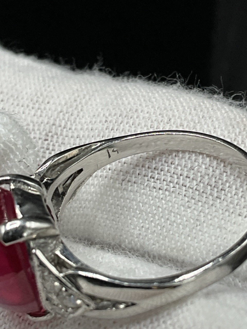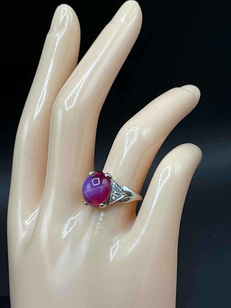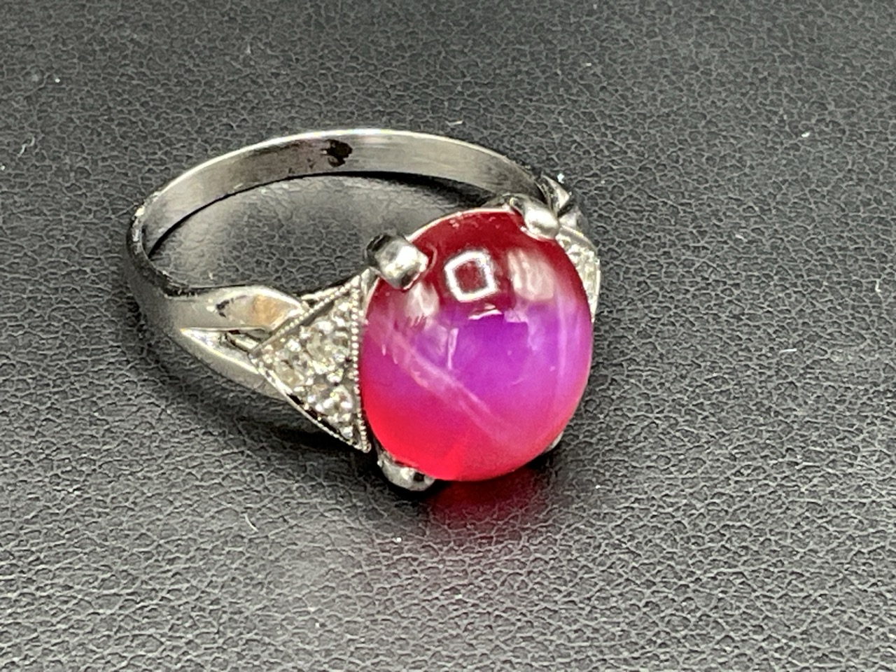 14K White Gold Lady's Ring with One (1) Synthetic Oval Star Ruby and Six (6) Single Cut Round Diamonds.