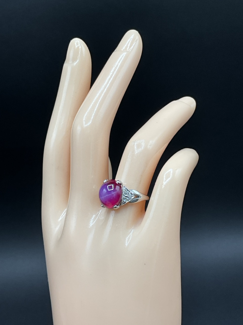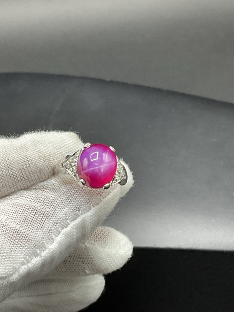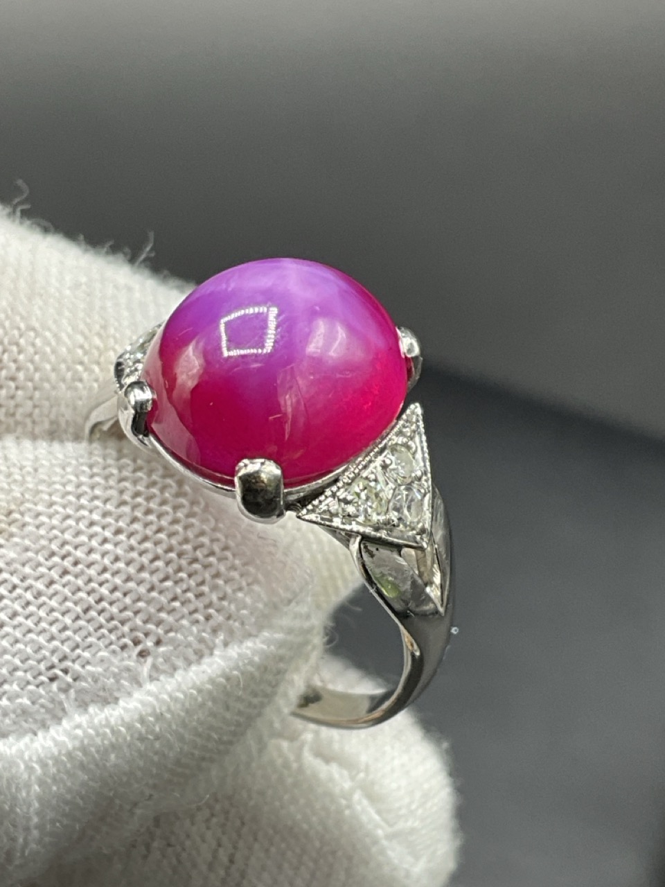 14K White Gold Lady's Ring with One (1) Synthetic Oval Star Ruby and Six (6) Single Cut Round Diamonds.
