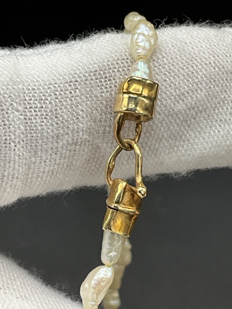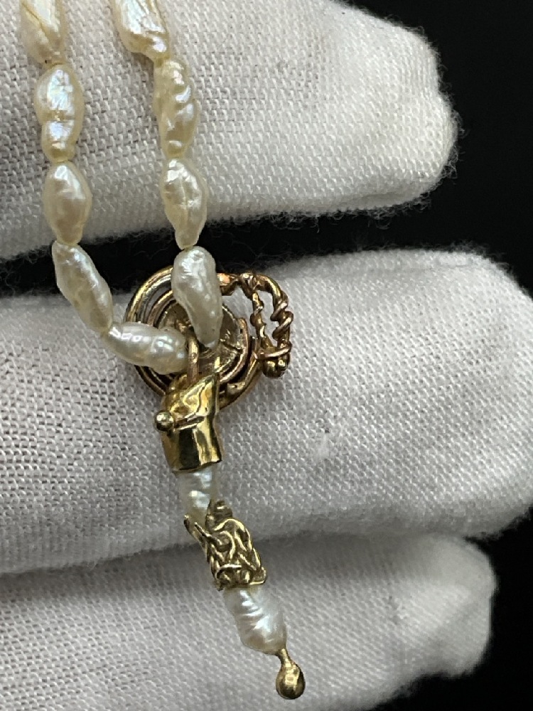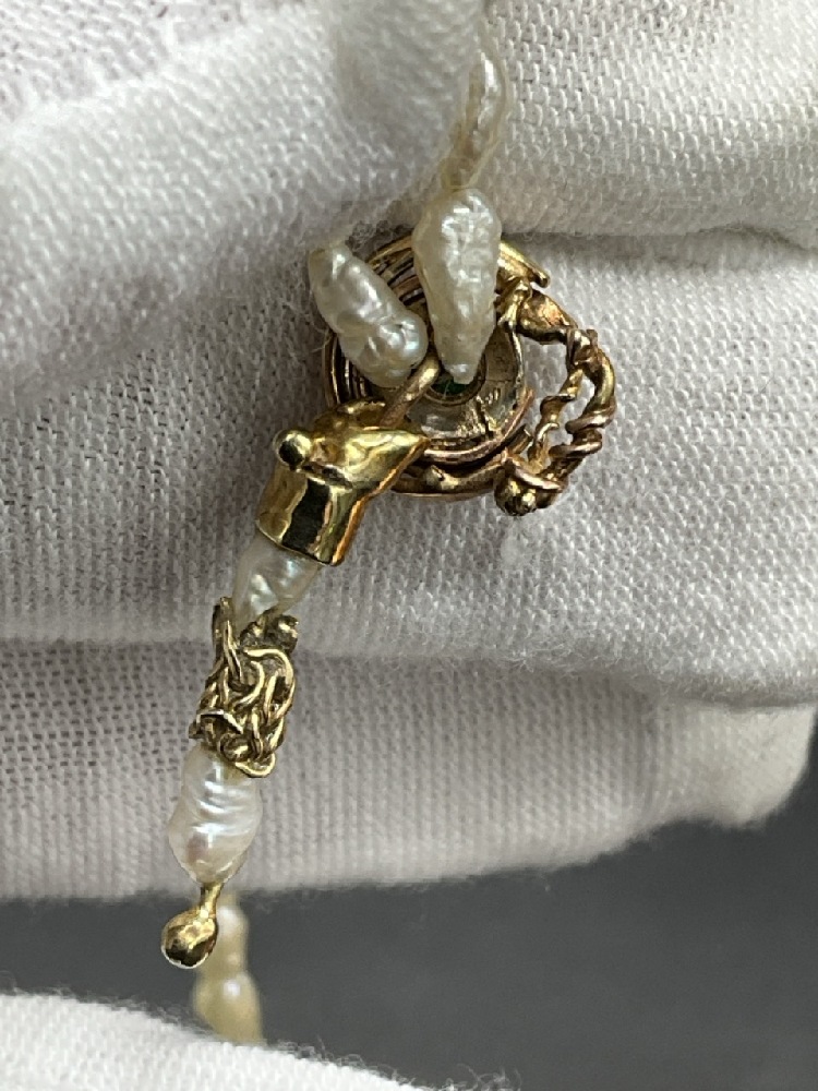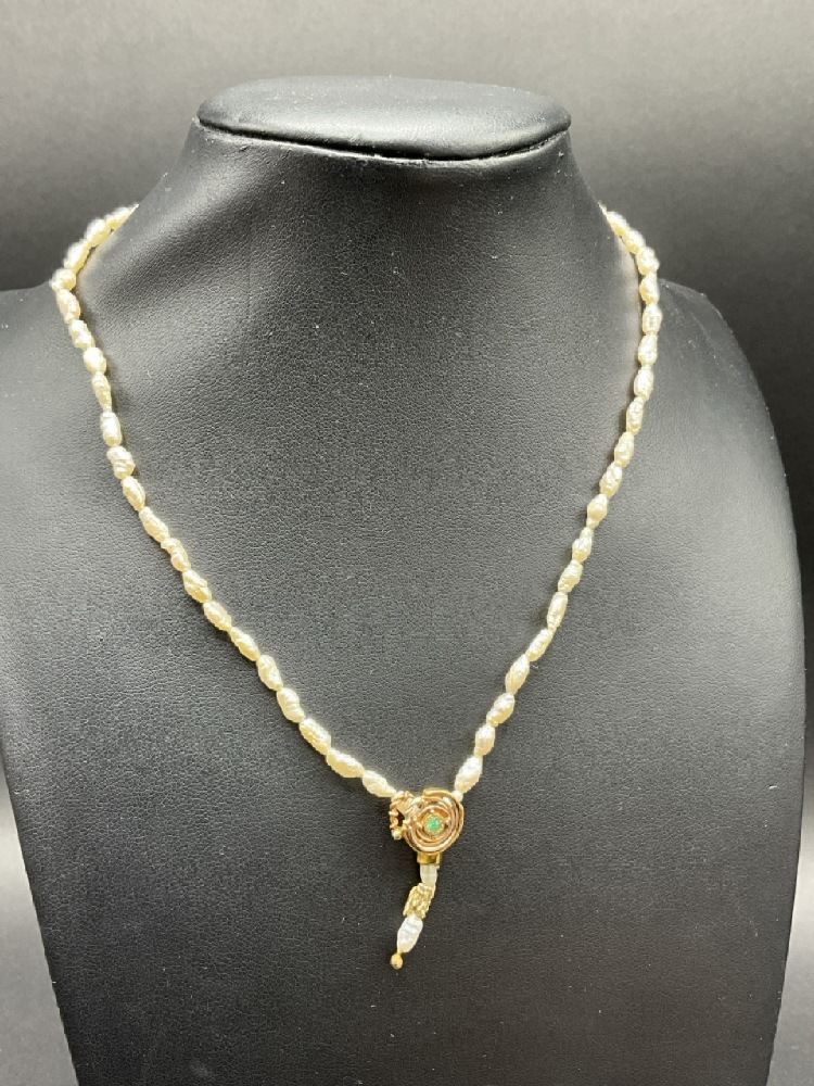 14 Yellow Gold Freshwater Rice Pearls and Natural Cut Green Emerald Necklace. Fifty-nine (59) freshwater rice pearls with a natural round cut green emerald surrounded by a 14k two tone handmade frame and dangle and a handmade 14k yellow gold clasp.