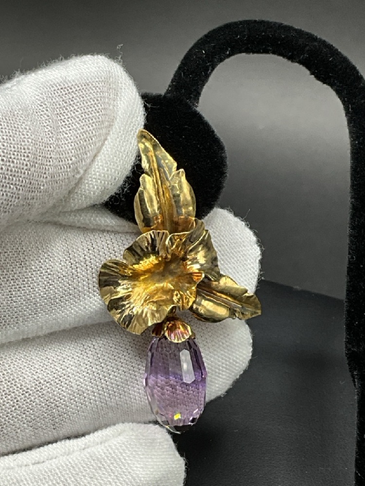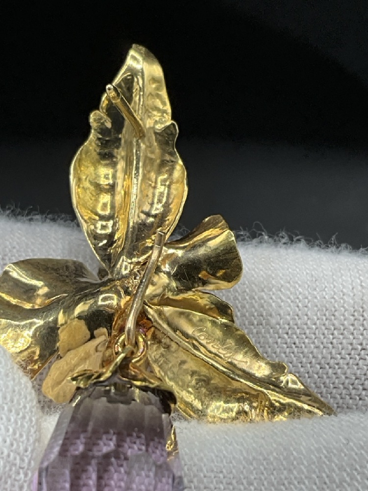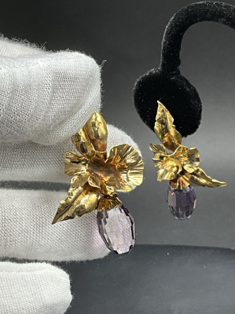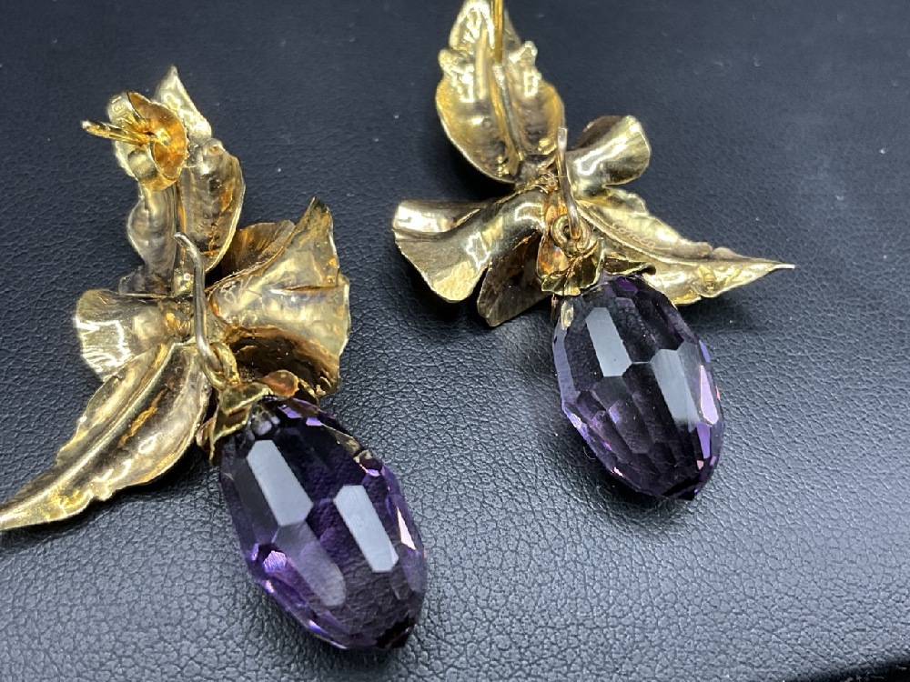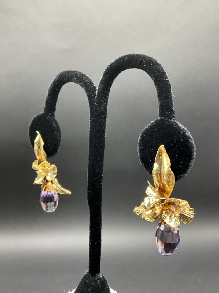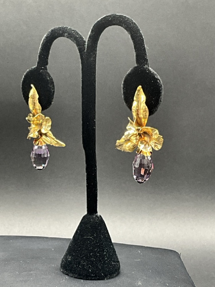 Earrings consist of two (2) natrual briolette cut amethyst detachable dangles with an 18k yellow gold hand made top and jump ring. The tops of the earrings consist of two (2) hand made leaf and flower design clusters with friction posts and fold over hook. The amethysts have a current clarity and color grade rated at VVS-Light Purple and measure approcimately 18.5mm X 10.2mm. Earrings are engraved Conty 18k.