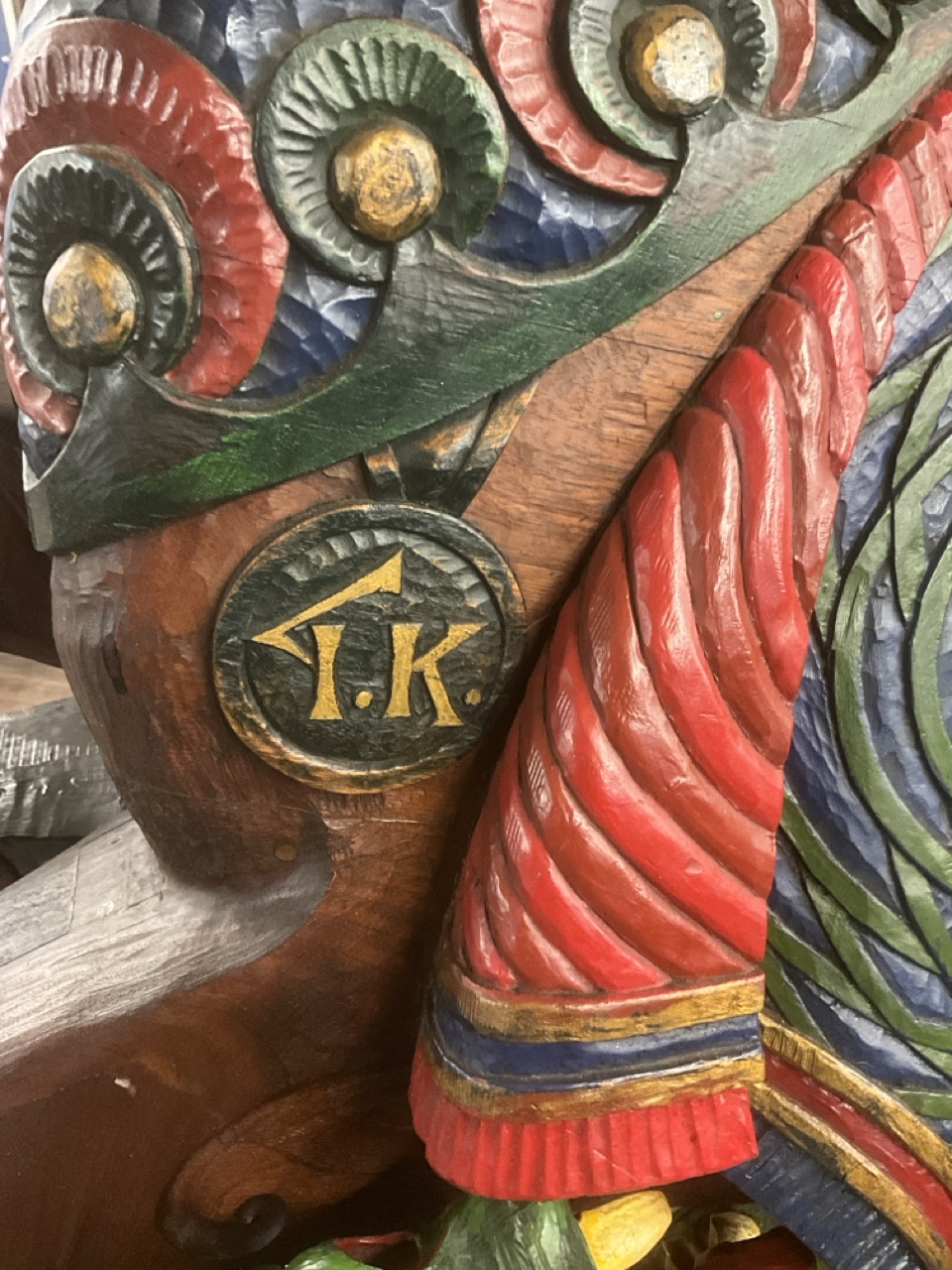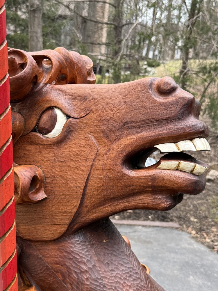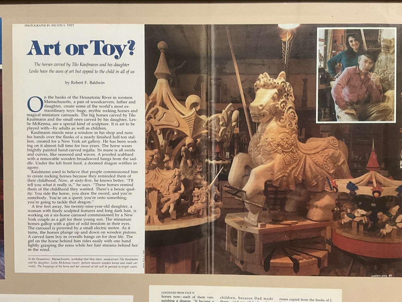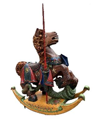 Tilo Kaufmann (American, 1920-2006) Life Size Carved Wooden Rocking Horse. A wonderful medieval themed work of art complete with jousting pole, sword and shield. A fire breathing dragon wraps around the underside of the horse.