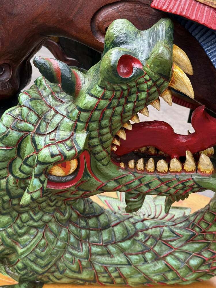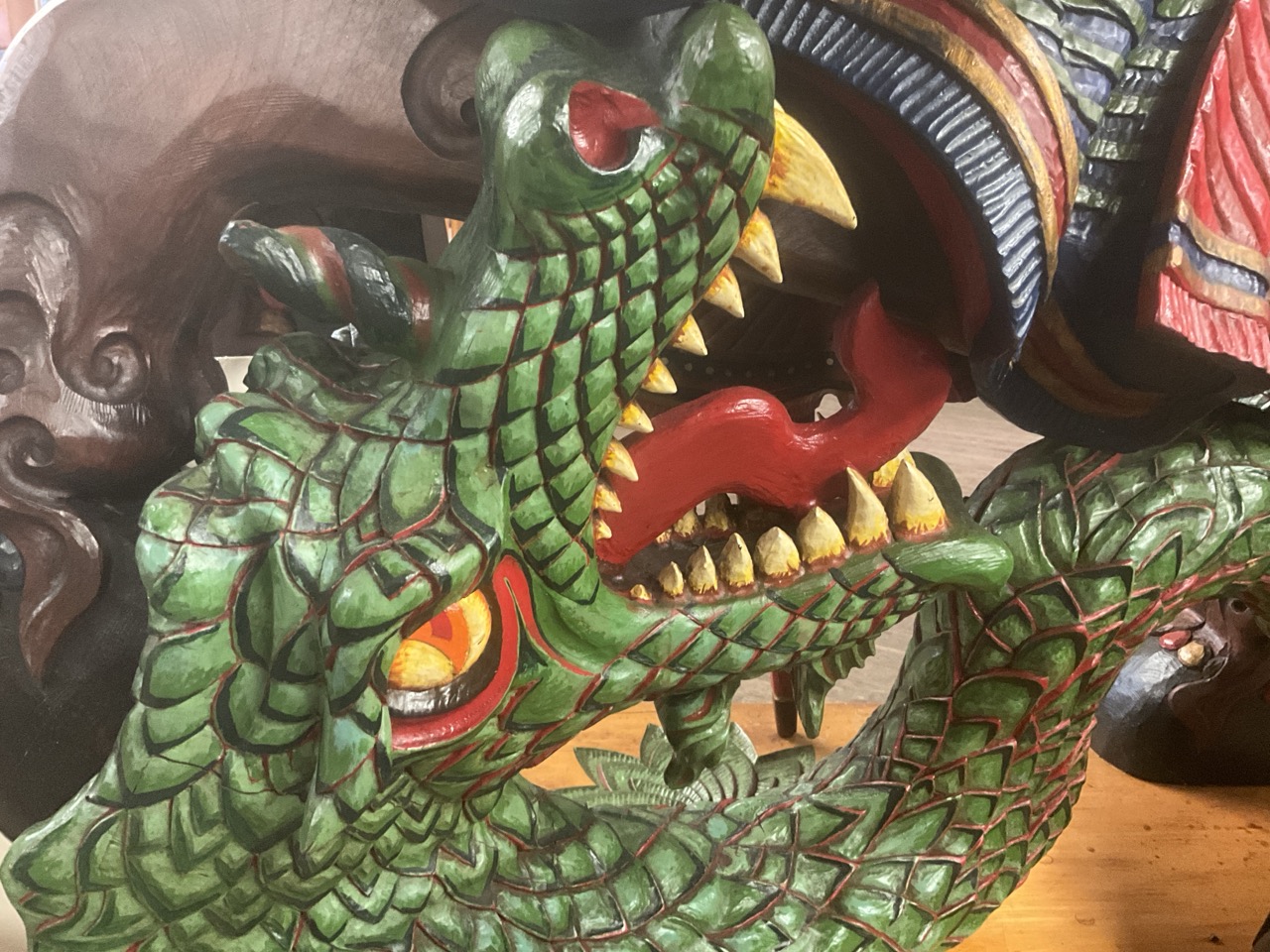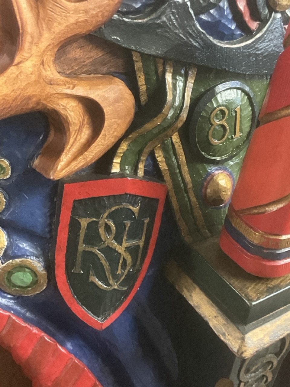 Tilo Kaufmann (American, 1920-2006) Life Size Carved Wooden Rocking Horse. A wonderful medieval themed work of art complete with jousting pole, sword and shield. A fire breathing dragon wraps around the underside of the horse.