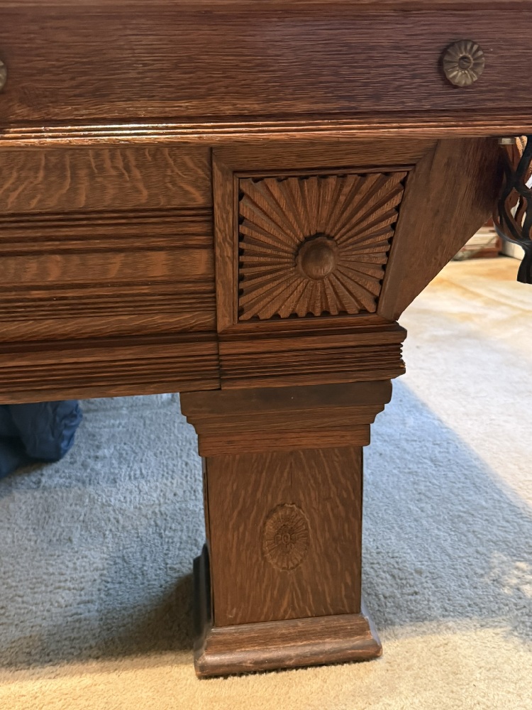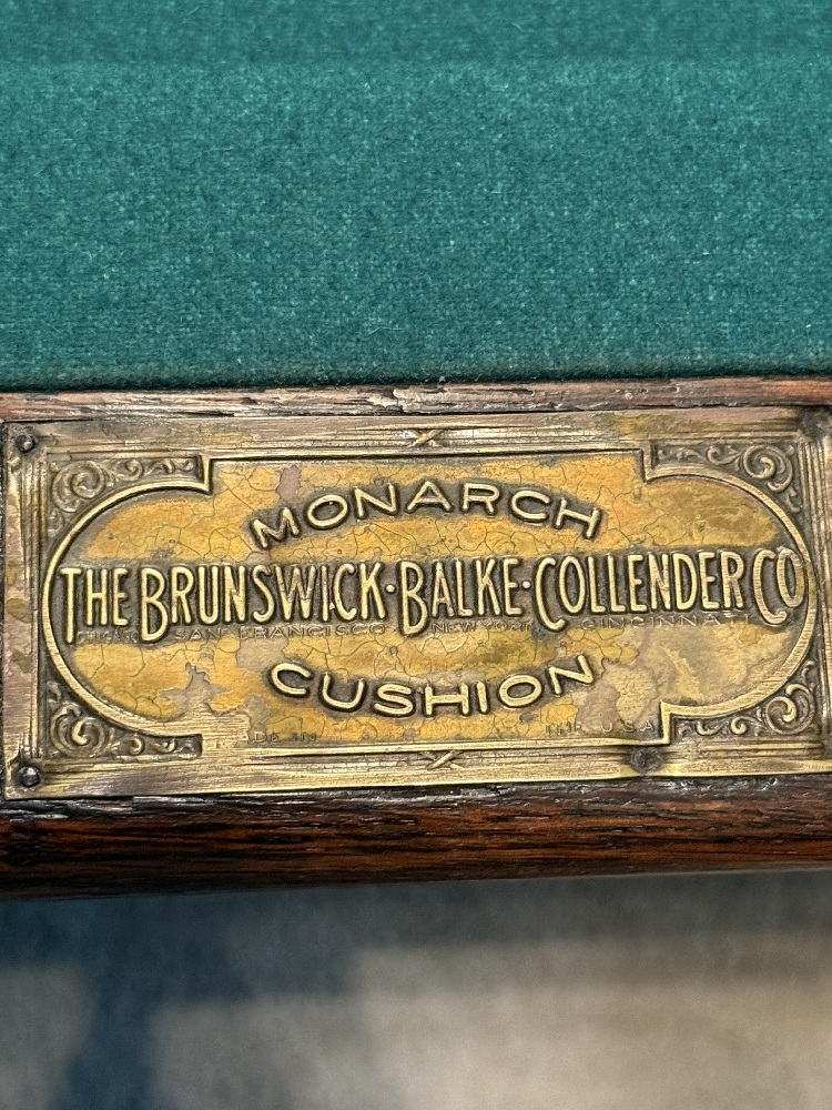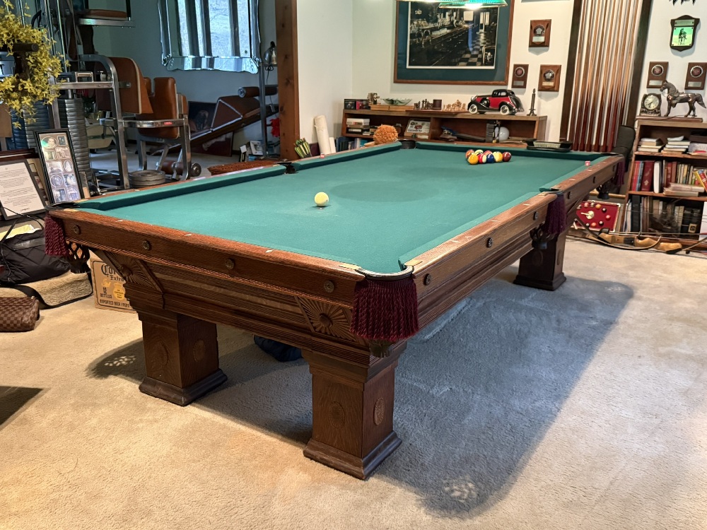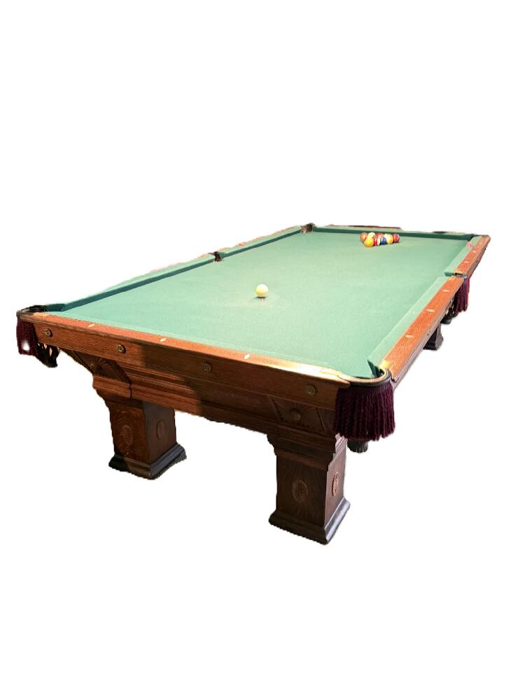 Brunswick- Balke- Collender Co. Billiards Pool Table and Extras. Includes antique pool stick racks and set of balls. This table is located in Cornwall, New York. Professional Pickup to be arranged only upon winning bid. Sound table, replaced green felt within last 10 years. Very good condition. Leather pockets. Bidder will have sufficient time to schedule removal.