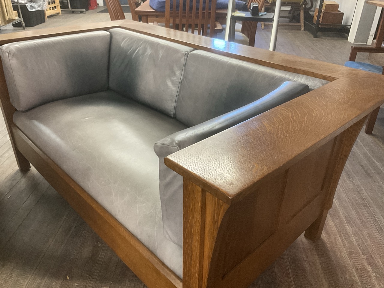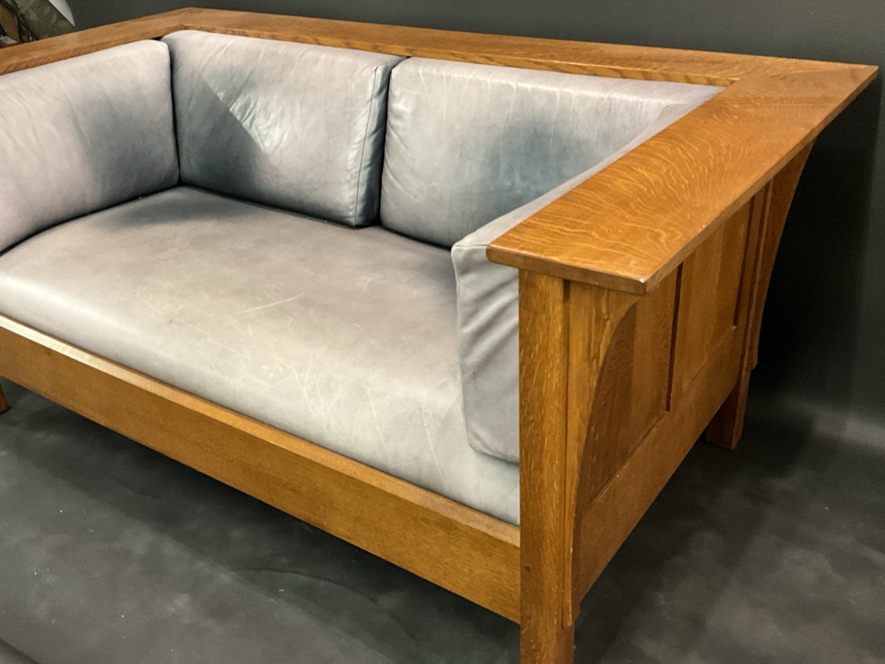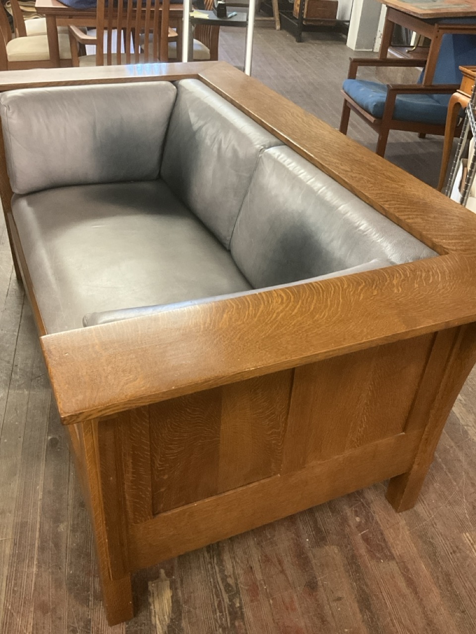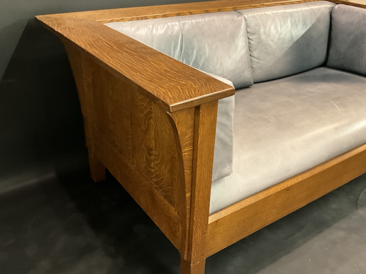 Stickley Art's and Crafts Settle or Sofa wit leather covered upholstery. Signed at base. Late 20th century.