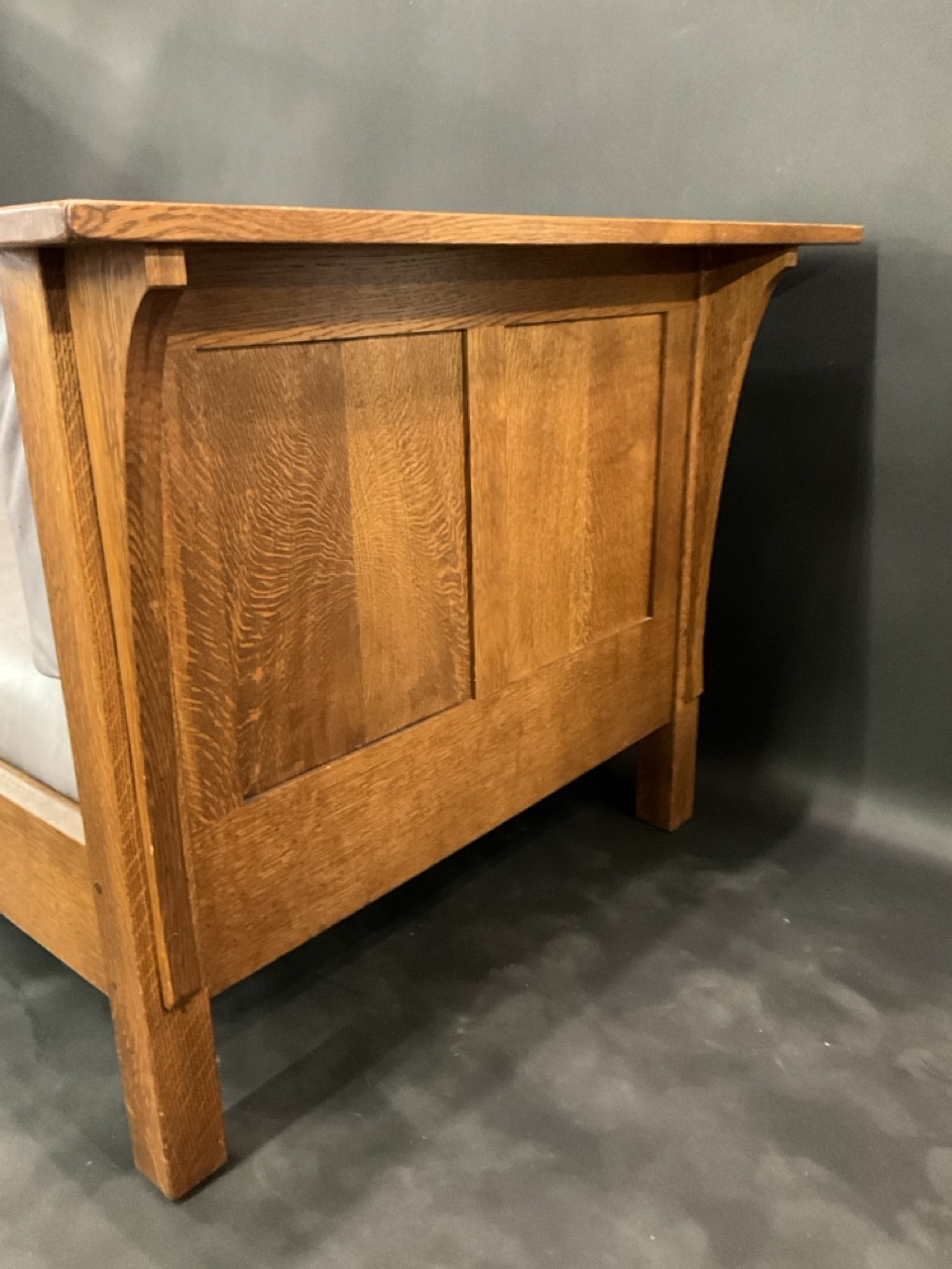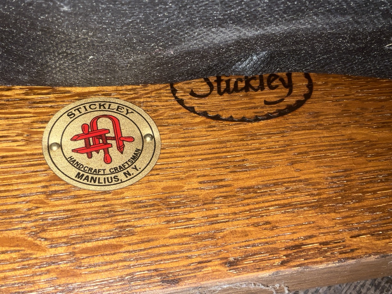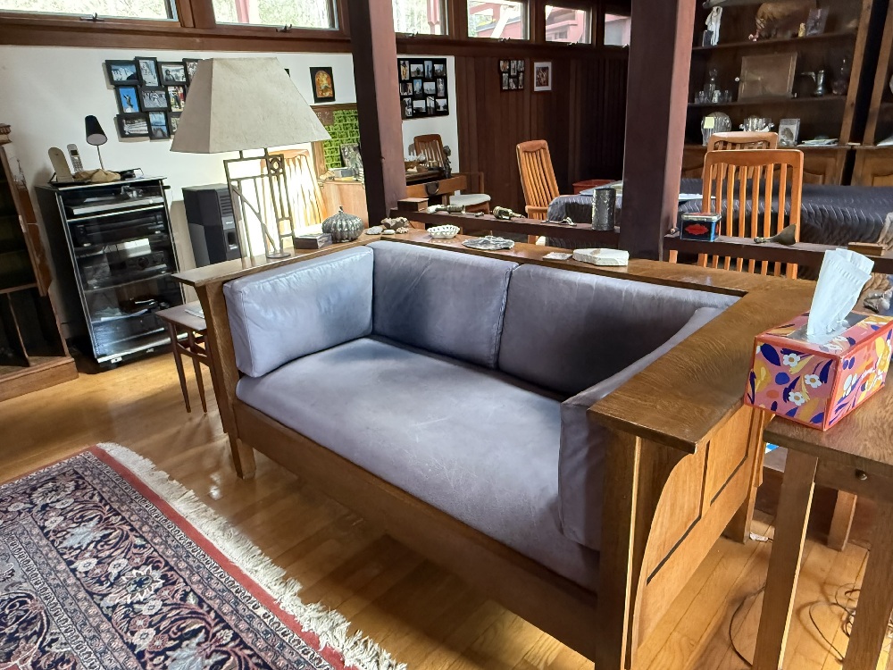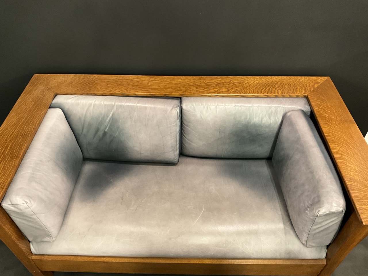 Stickley Art's and Crafts Settle or Sofa wit leather covered upholstery. Signed at base. Late 20th century.