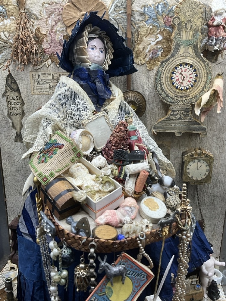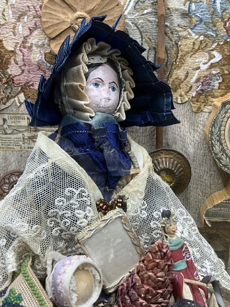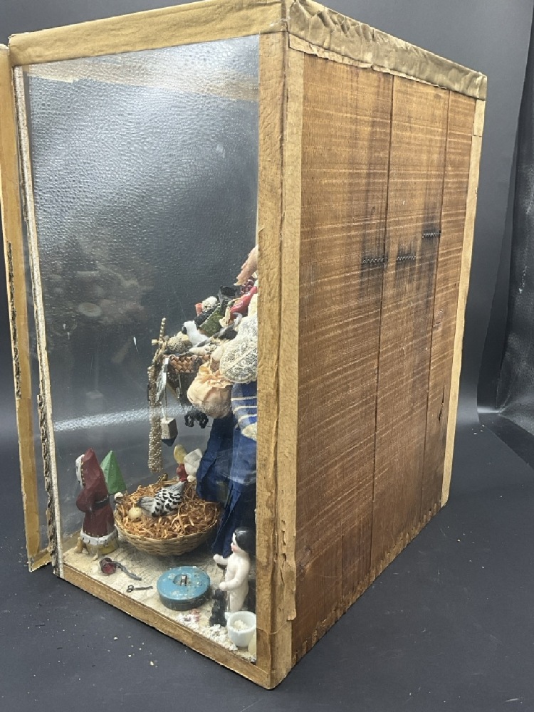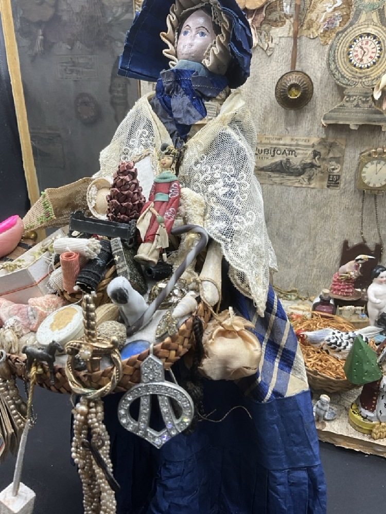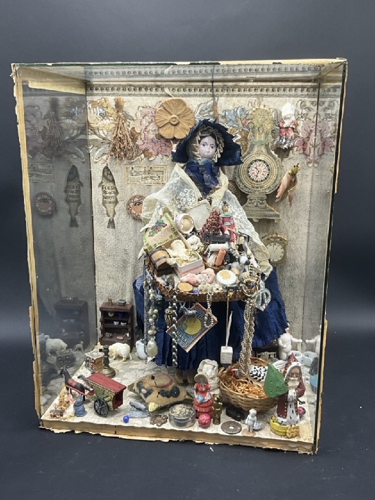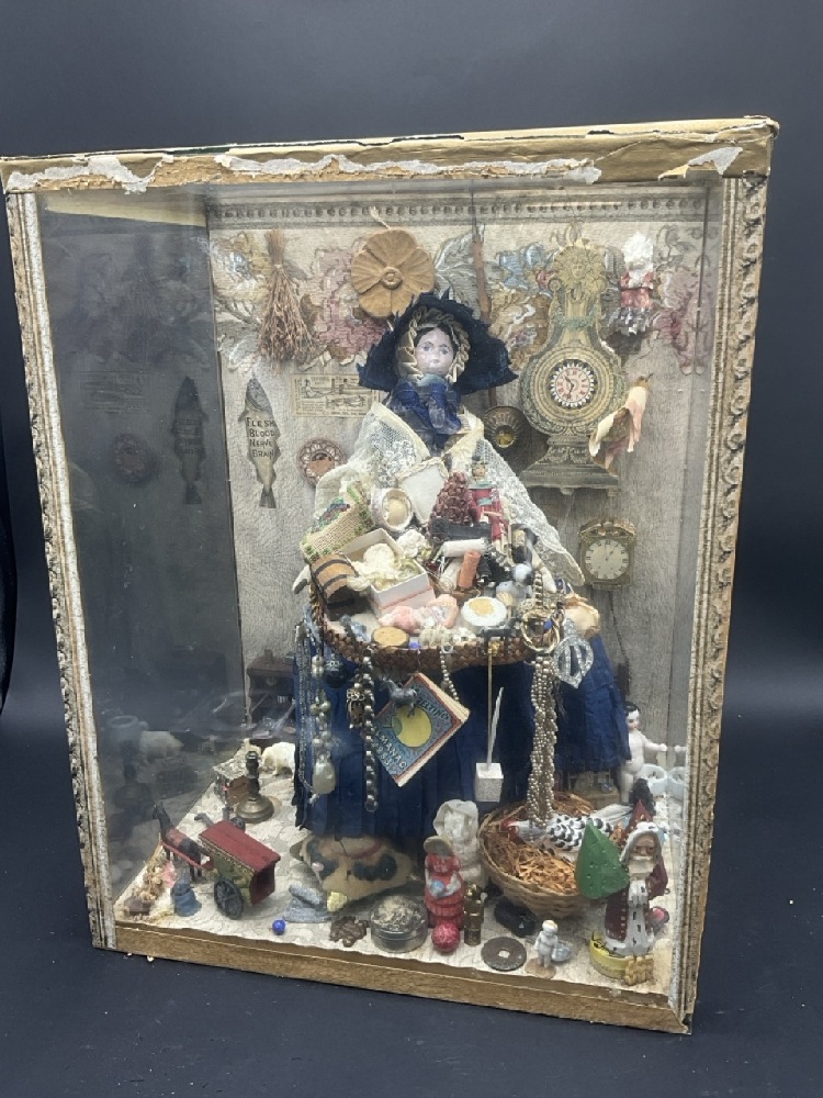 A fun Victorian style Peddler Doll. Housed in a crate made glass box. Some loose pieces noted and front glass is detached from box due to needing to sit her back up as she had fallen over and refused to stand back up straight without assistance.