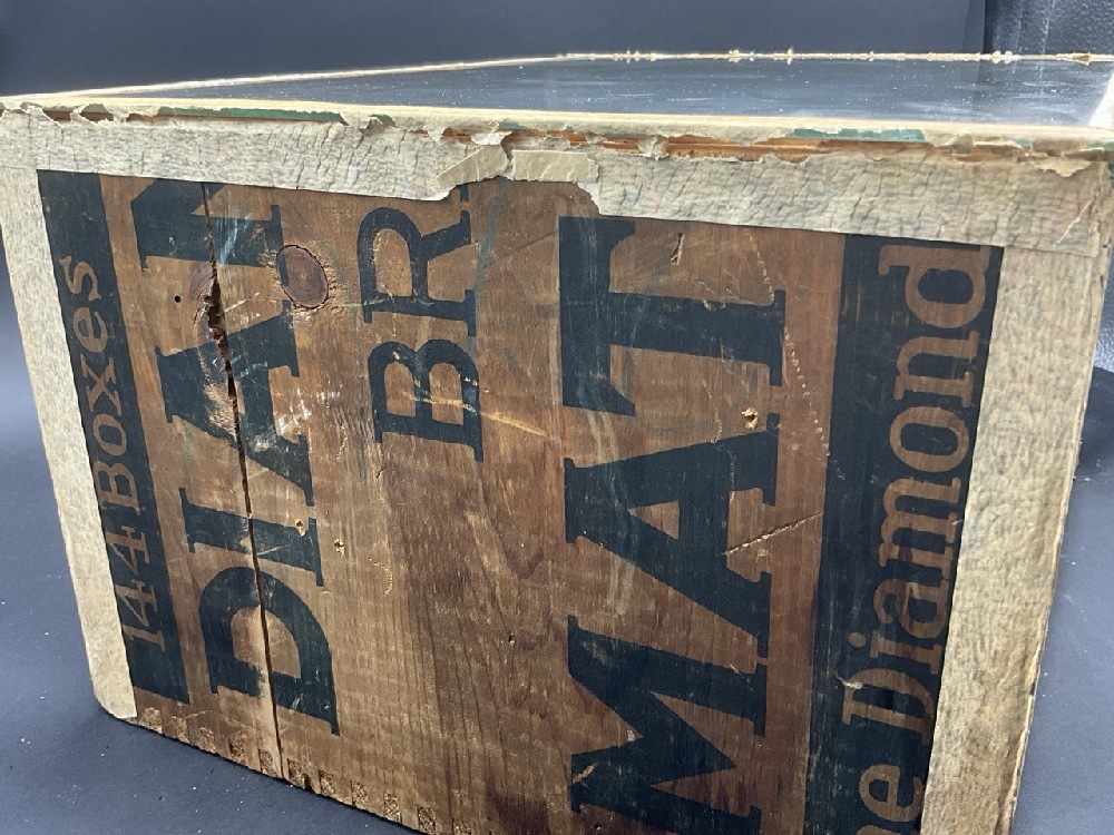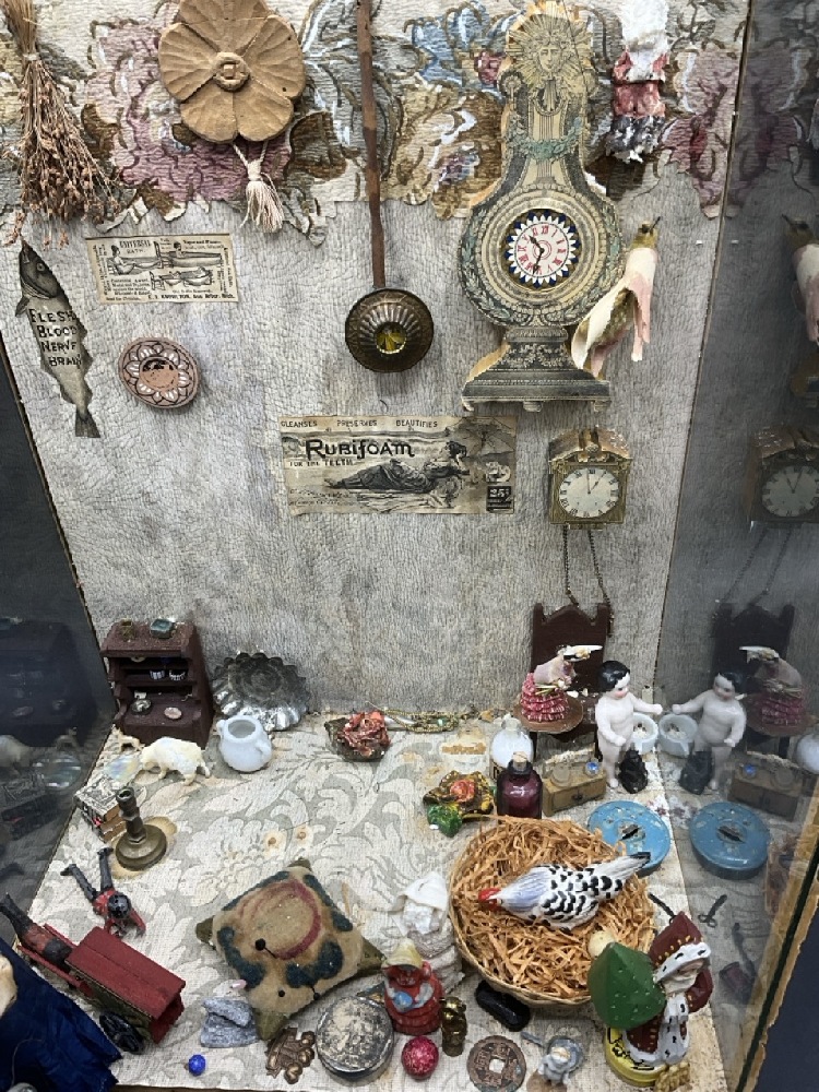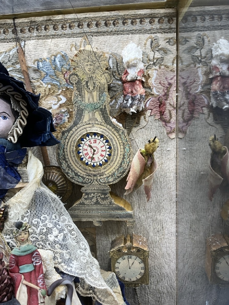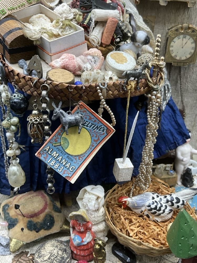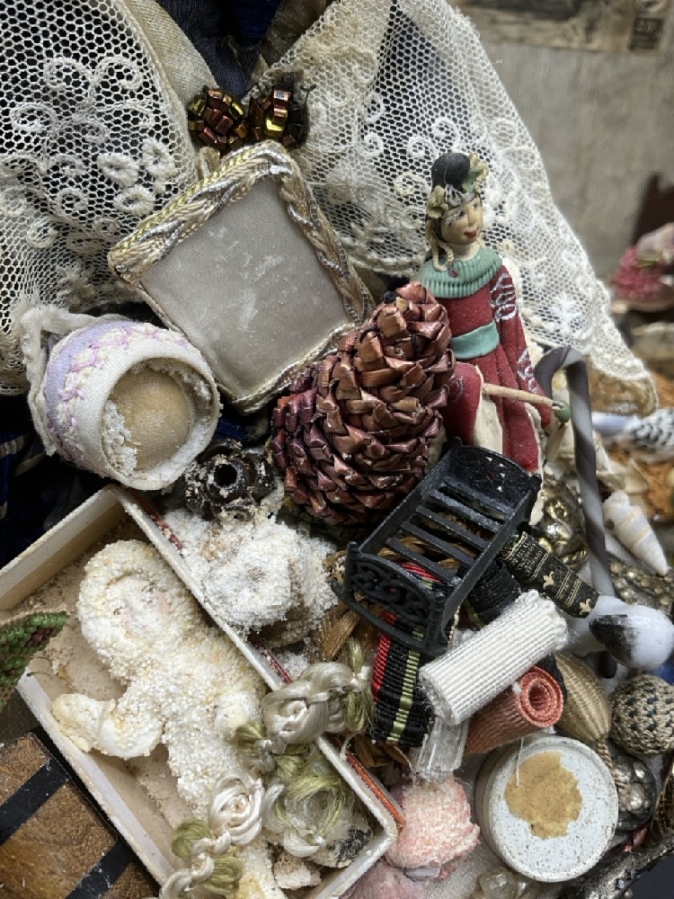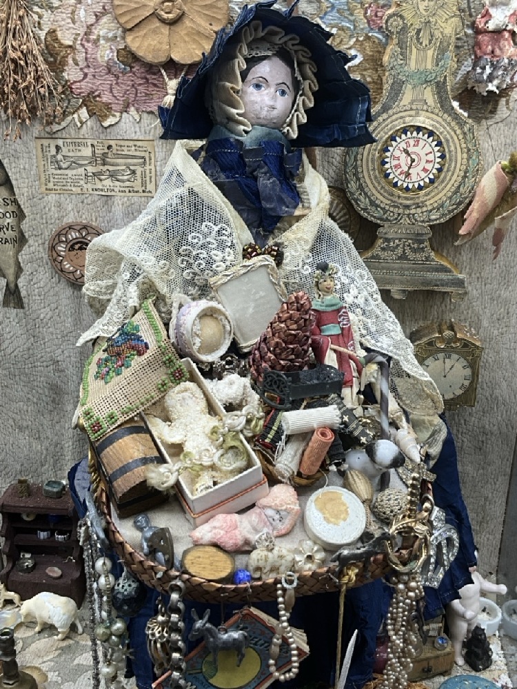A fun Victorian style Peddler Doll. Housed in a crate made glass box. Some loose pieces noted and front glass is detached from box due to needing to sit her back up as she had fallen over and refused to stand back up straight without assistance.