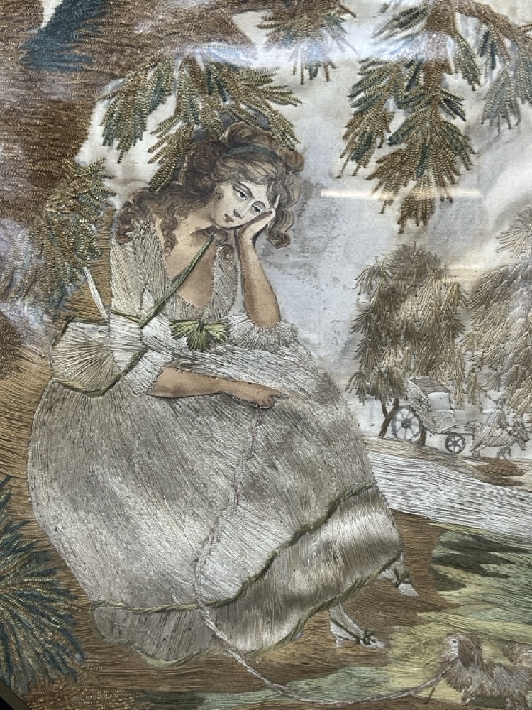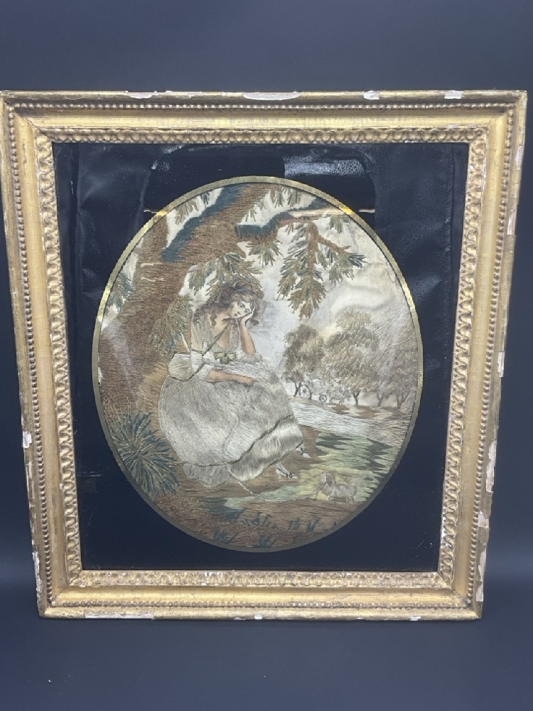 1800's Silk Embroidery Work. Lady sitting in boredom or despair with her dog.