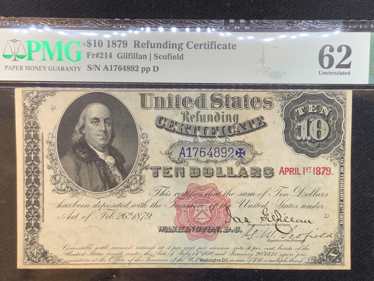 $10 1879 Refunding Certificate FR #214 Gilfallan/Scofield PMG graded 62 Uncirculated Toned.