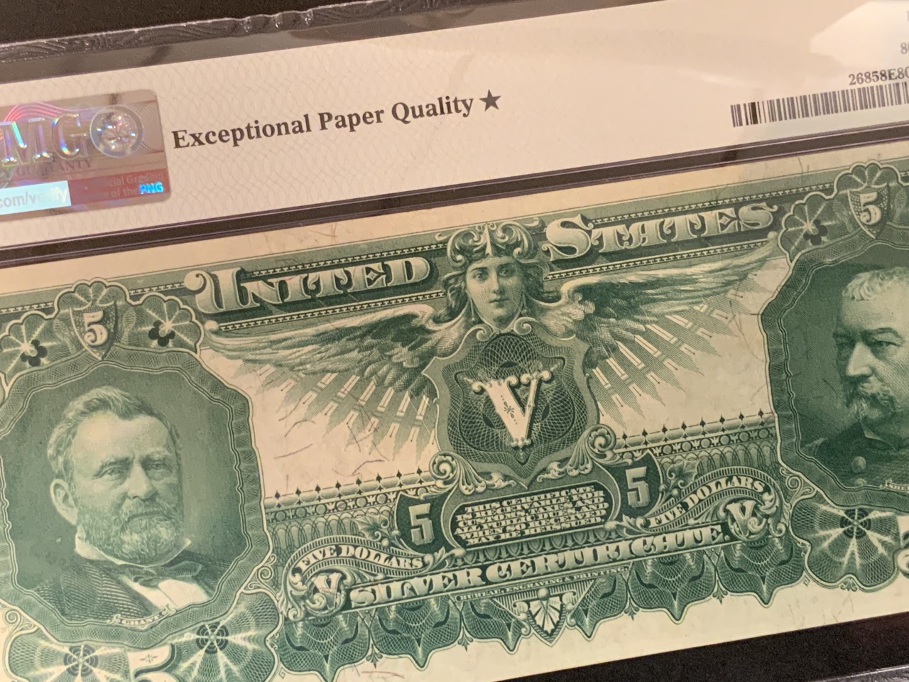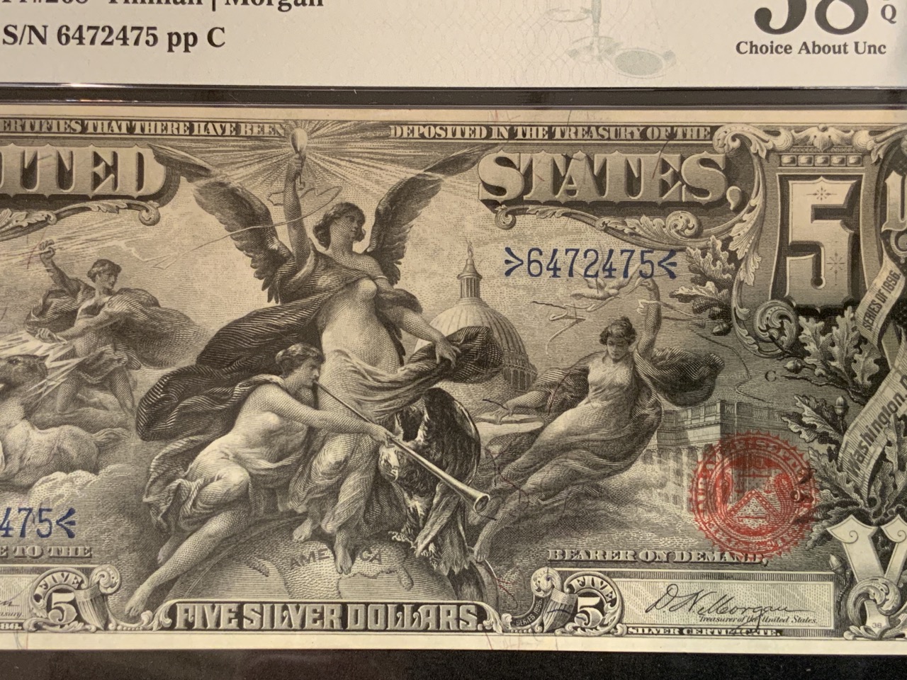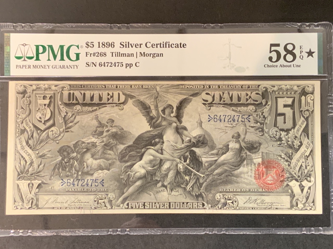 $5 1896 Educational silver certificate. PMG 58 Excellent Paper Quality.