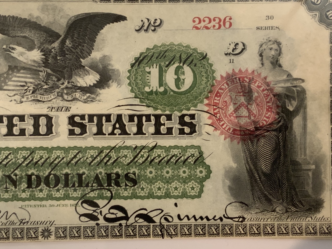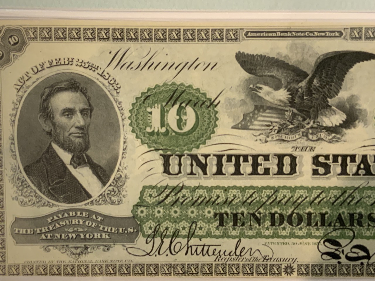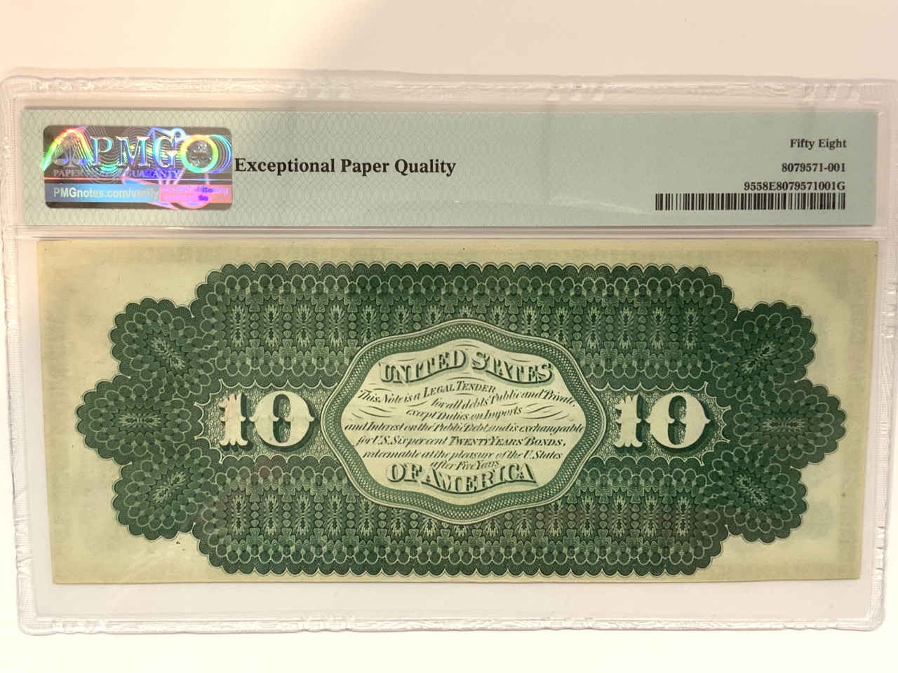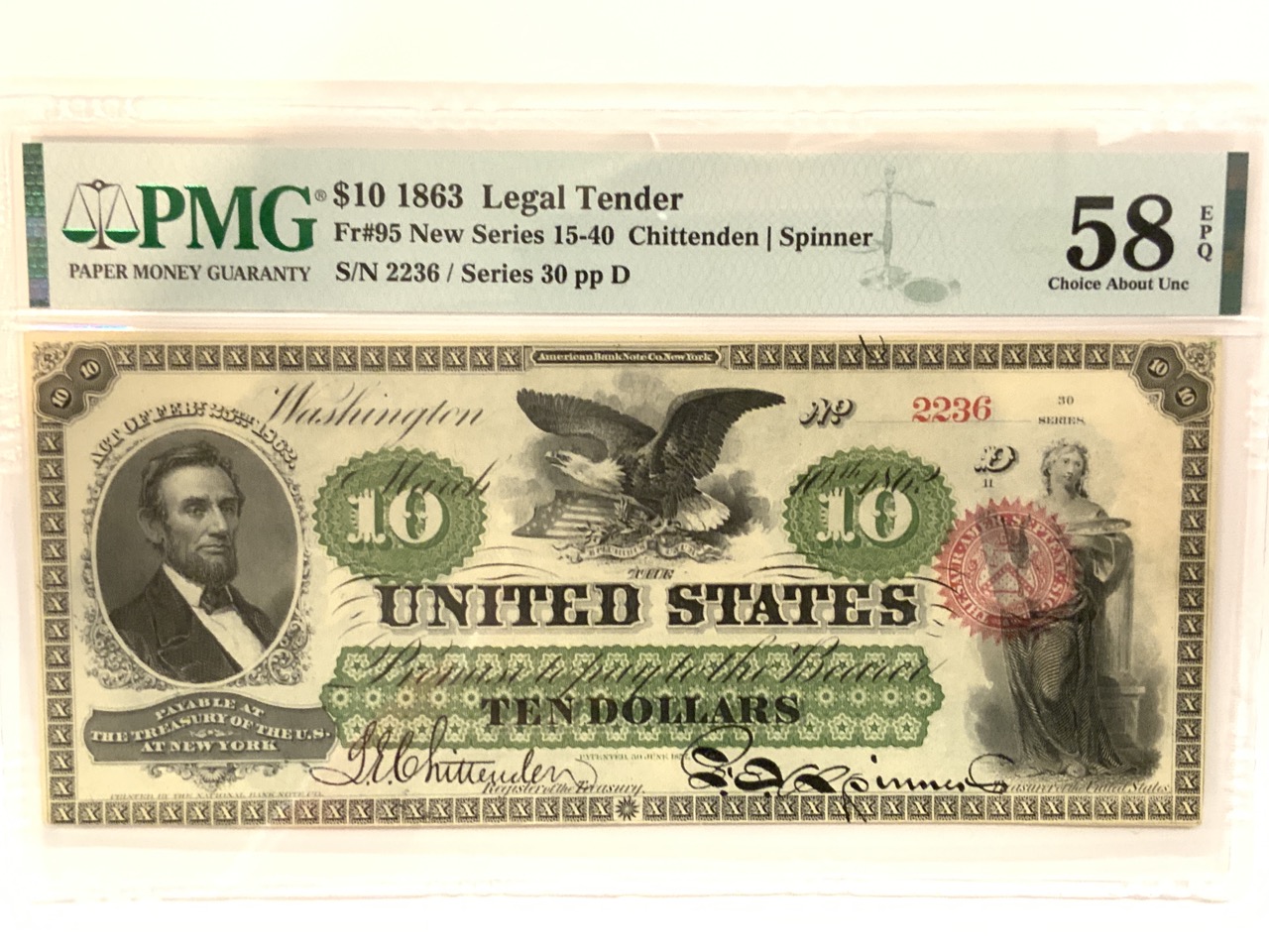 1863 $10 Legal Tender Note Fr.95 PMG Choice About New EPQ Excellent Paper Quality.