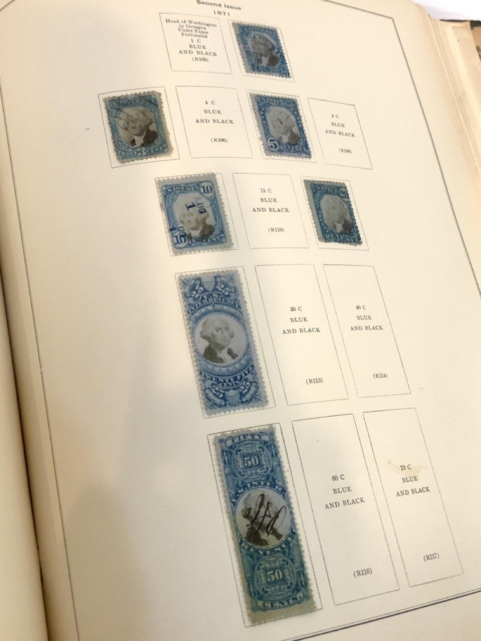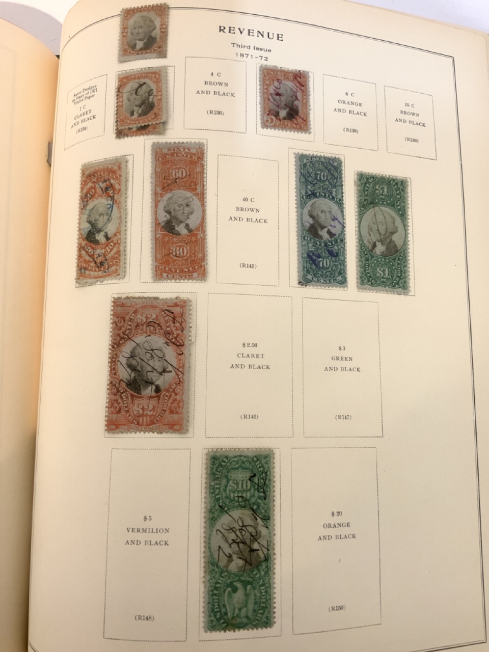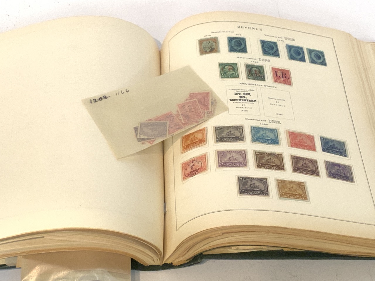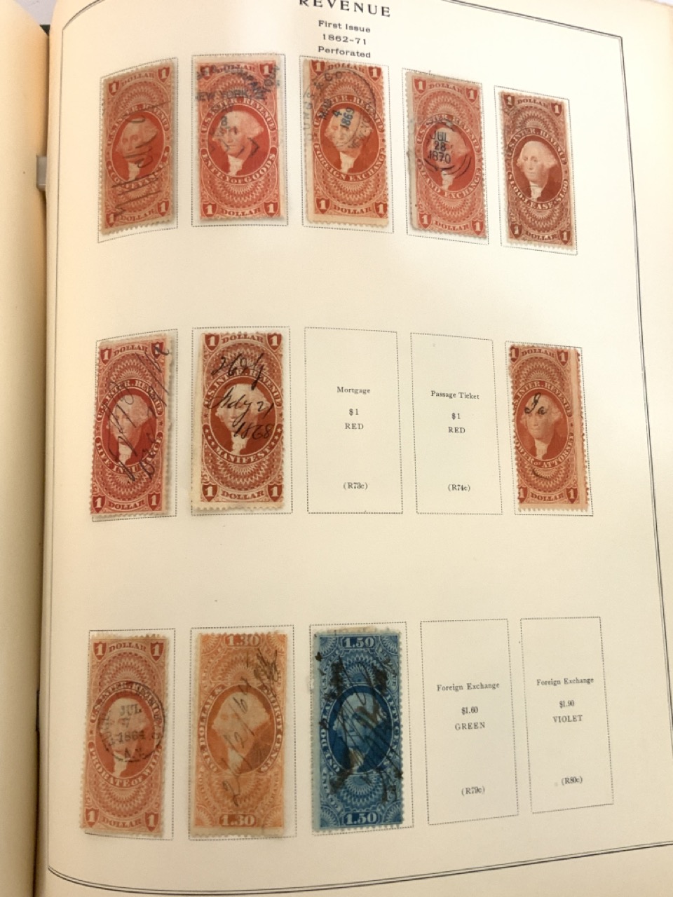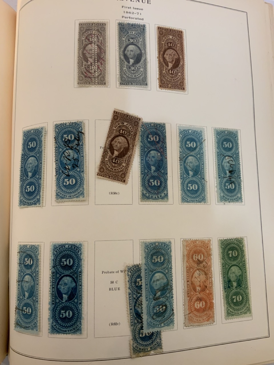 National Stamp Album with contents. A full album with revnue stamps, hand postmarked, 19th century. Mortgage, Tax etc.