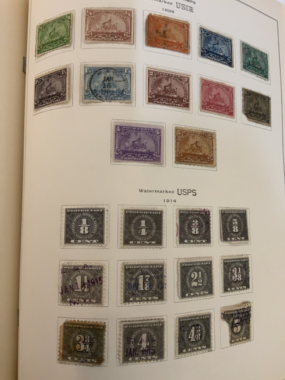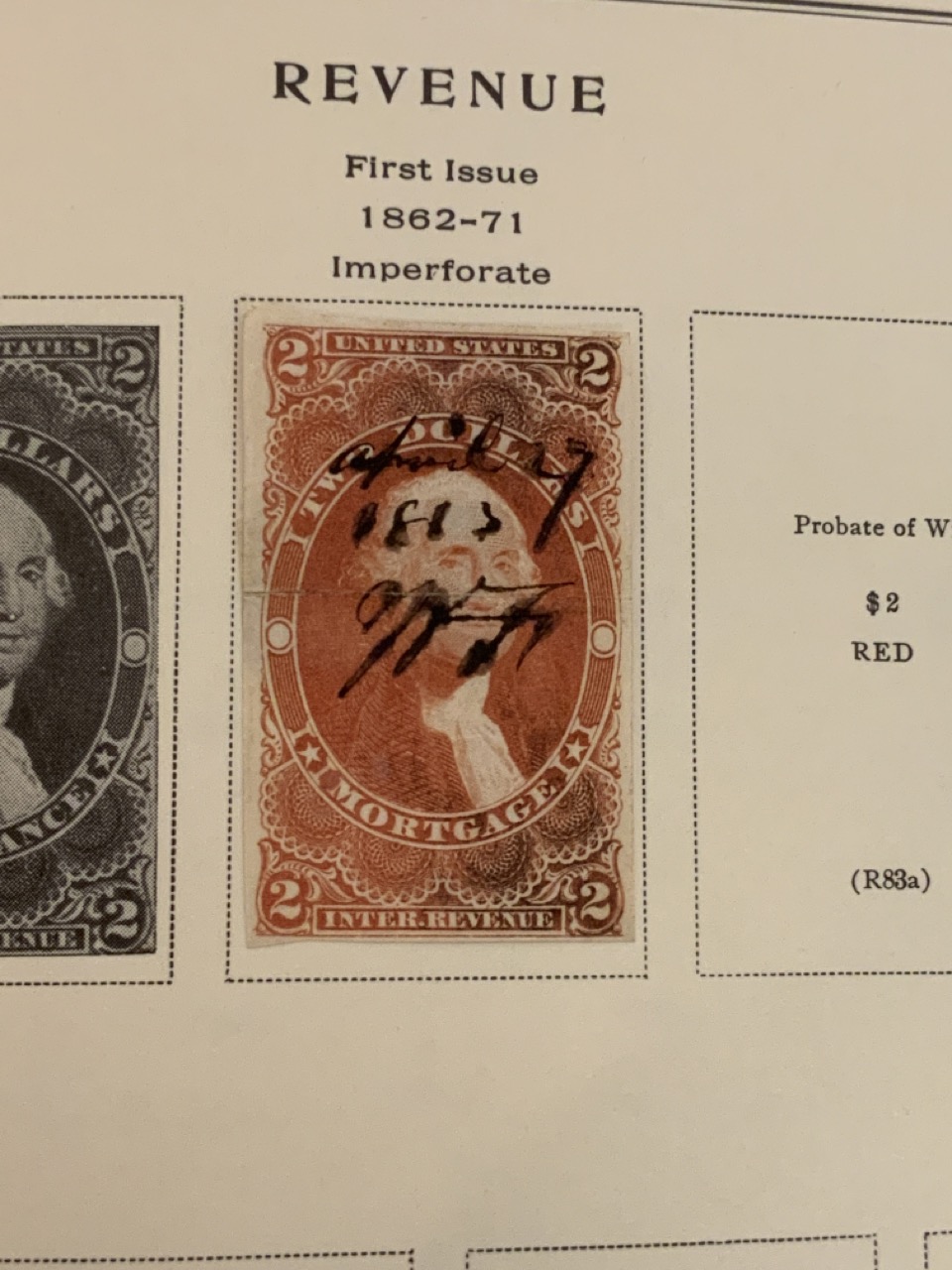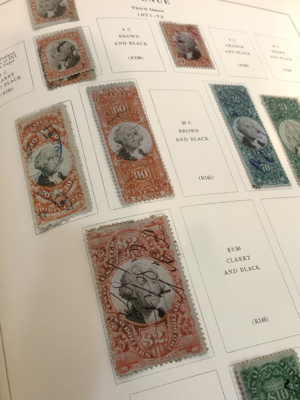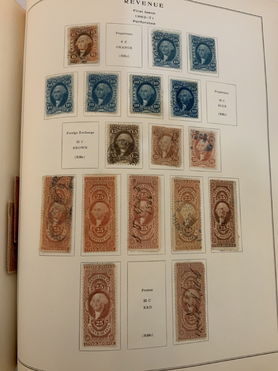 National Stamp Album with contents. A full album with revnue stamps, hand postmarked, 19th century. Mortgage, Tax etc.