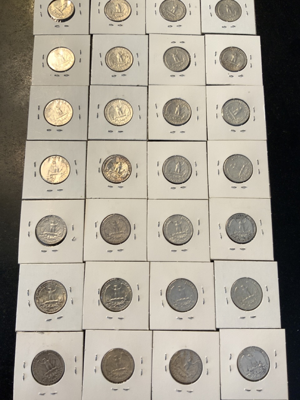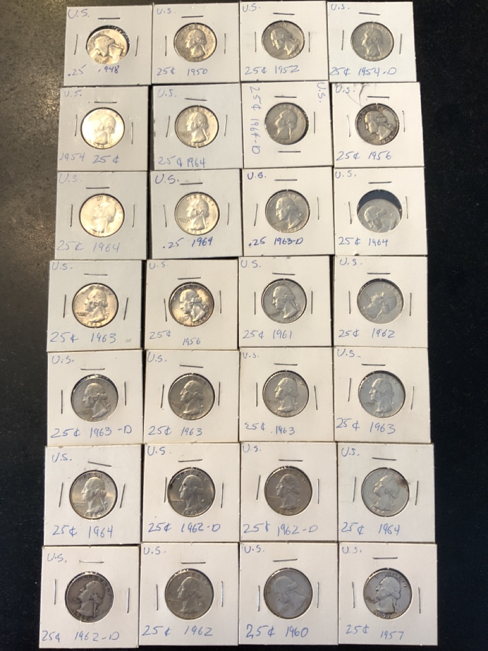 Twenty-Eight U.S. Silver Washington Quarters Lot. 1964 and earlier. Estate compiled.
