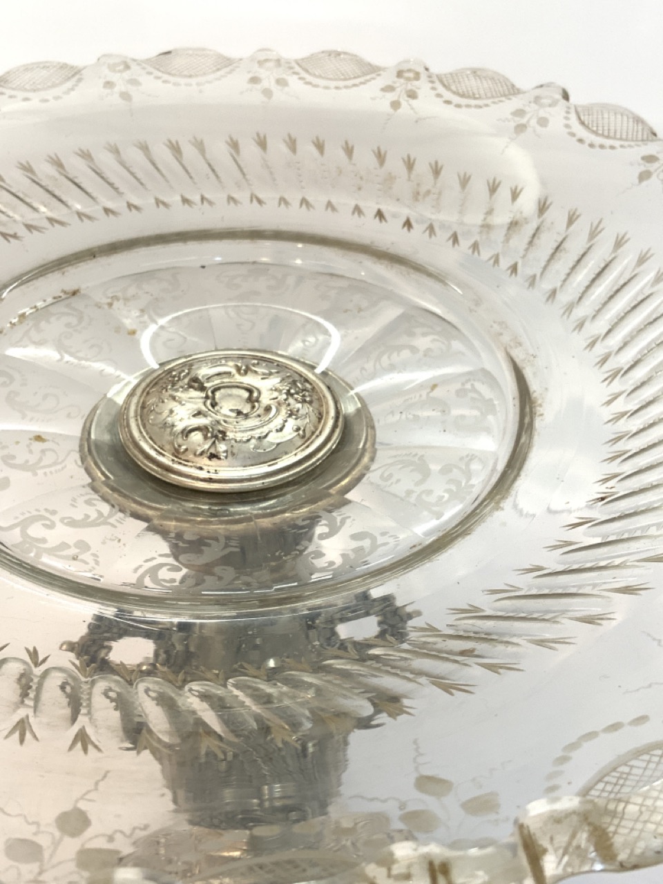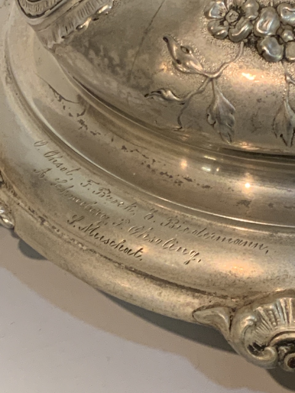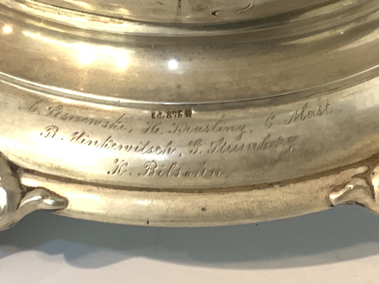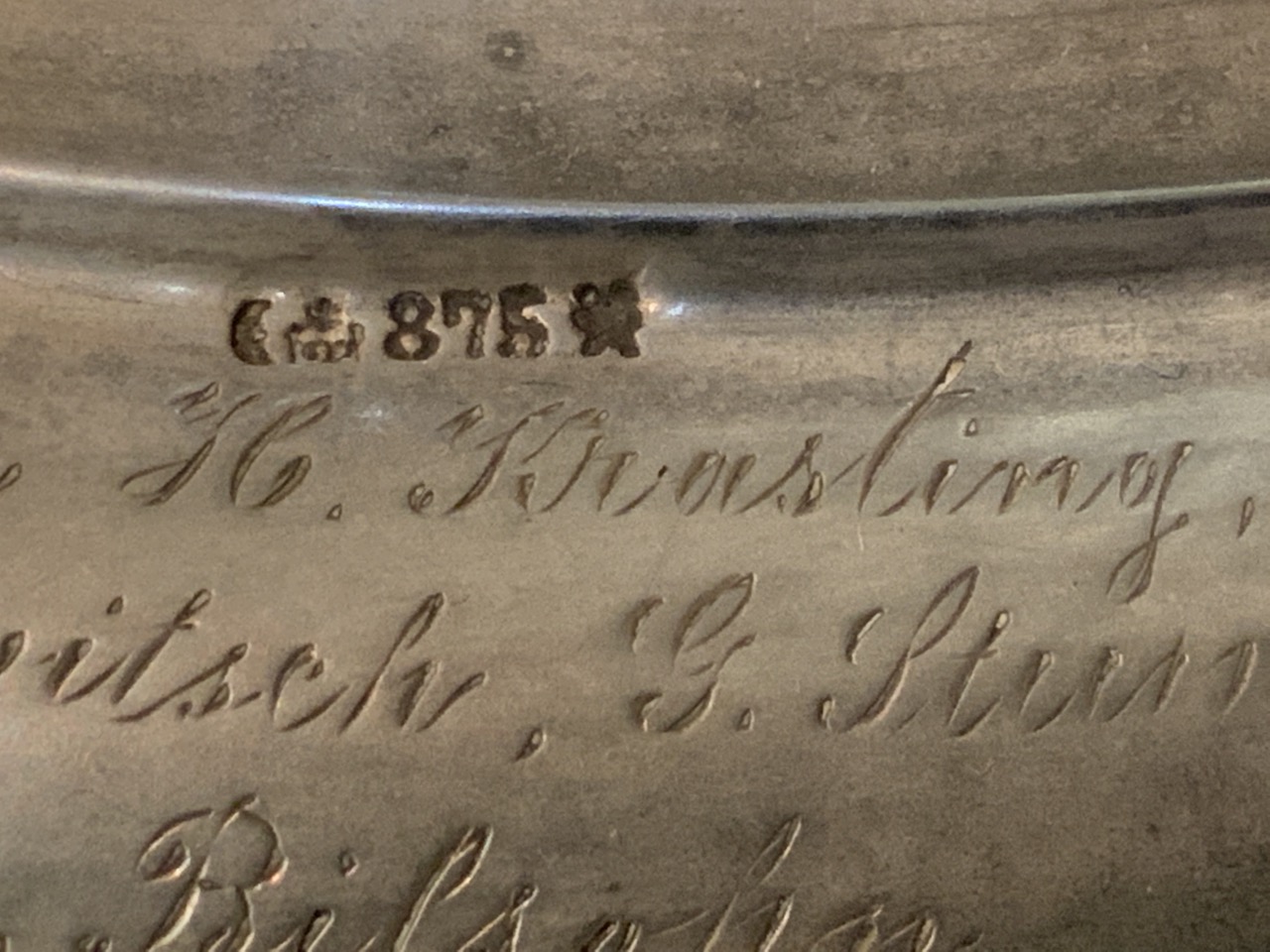 Prominent large serving compote. 875 silver German. Marked with half moon and crown mark. Early 20th century. Inscribed in German and dated 1901.