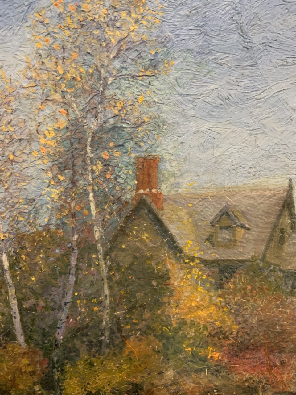 American Impressionist style landscape with Victorian style home within the trees.