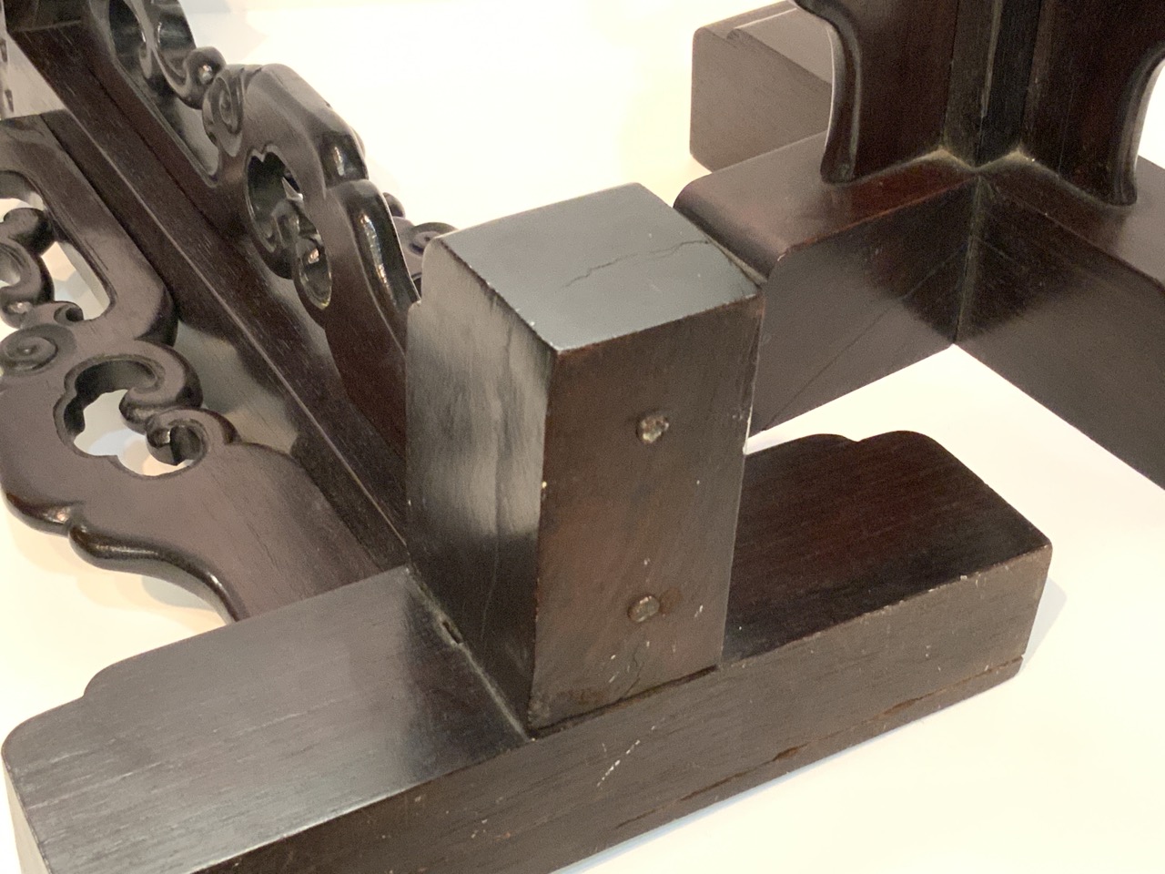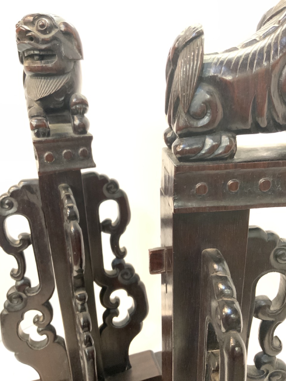CHinese rosewood hat stands with carved foo dogs.