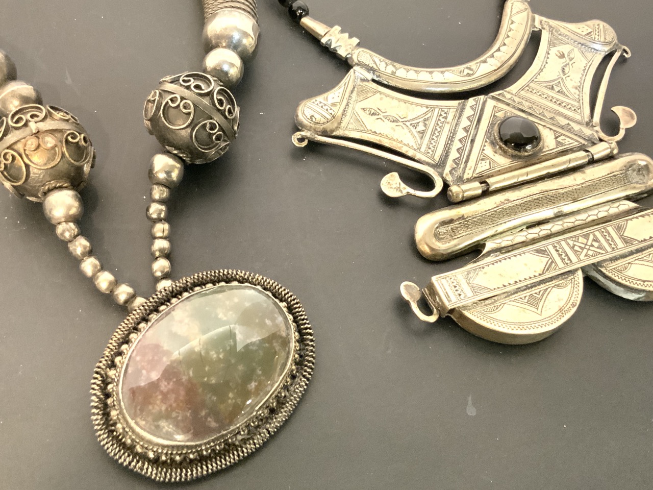 Two (2) Mid Eastern Persian silver and black onyx necklaces. Tested for silver >900