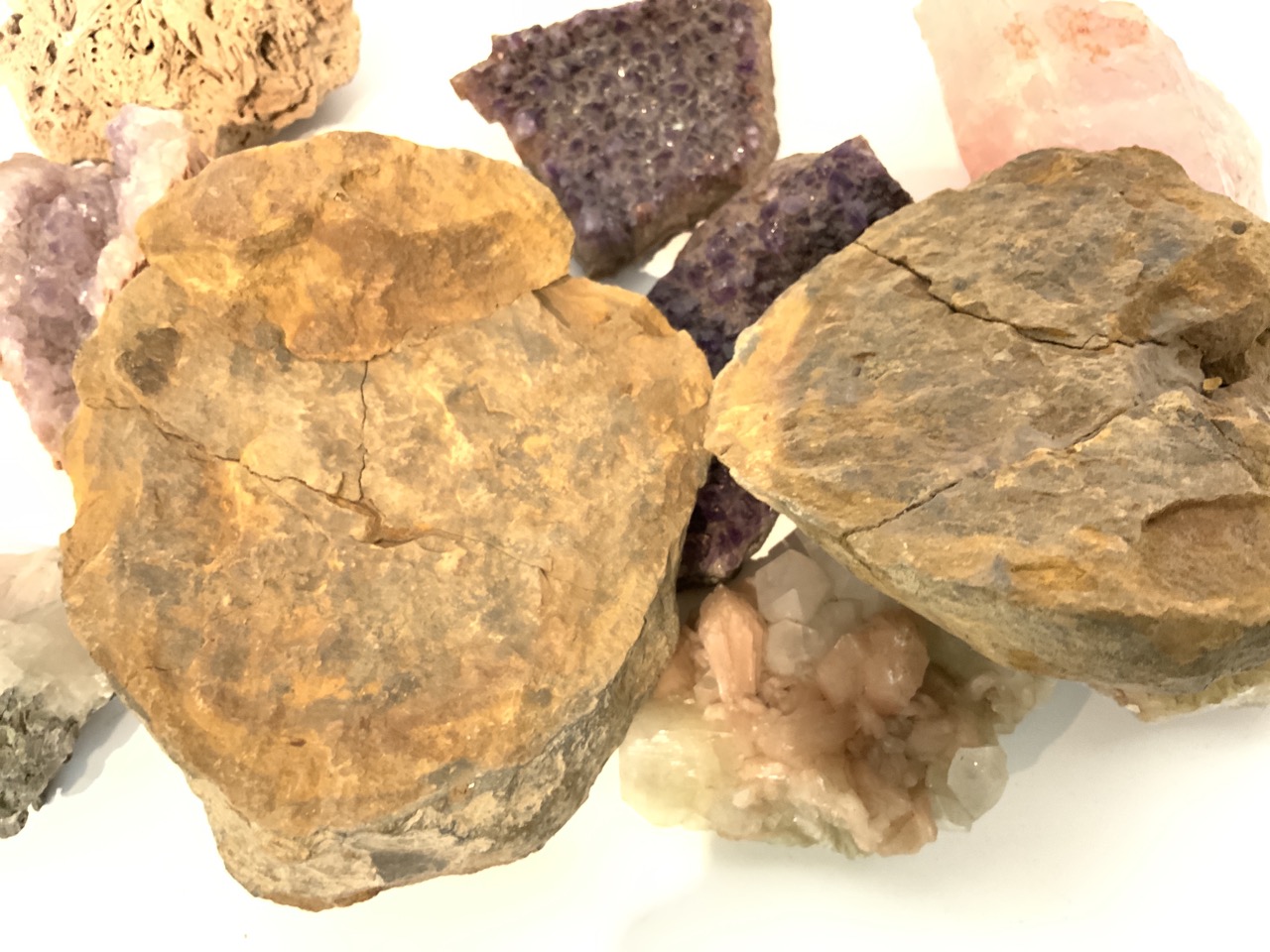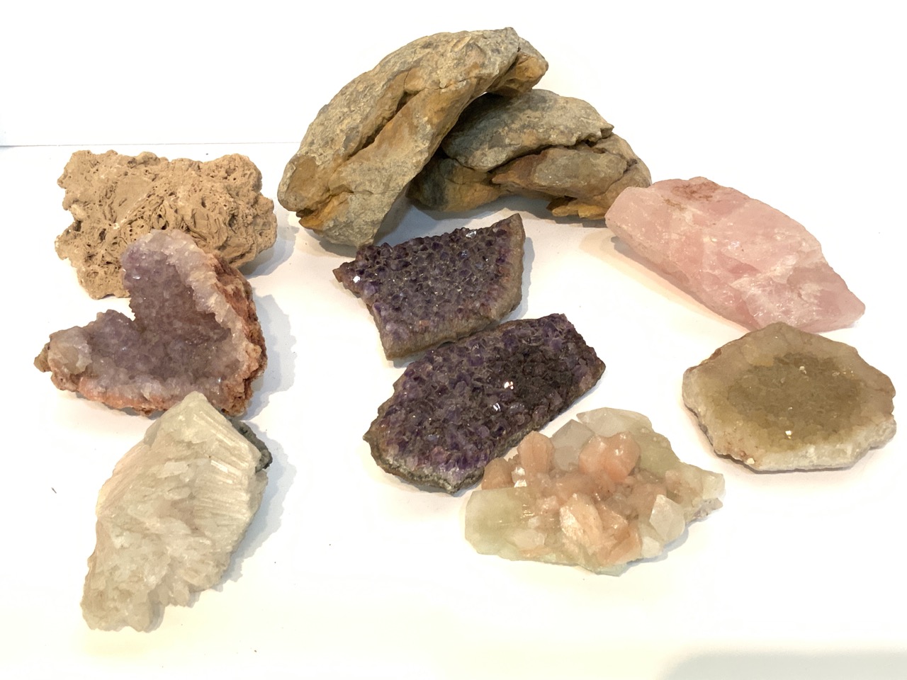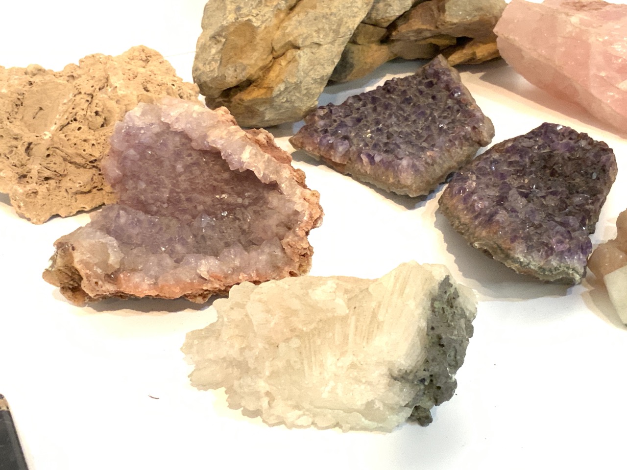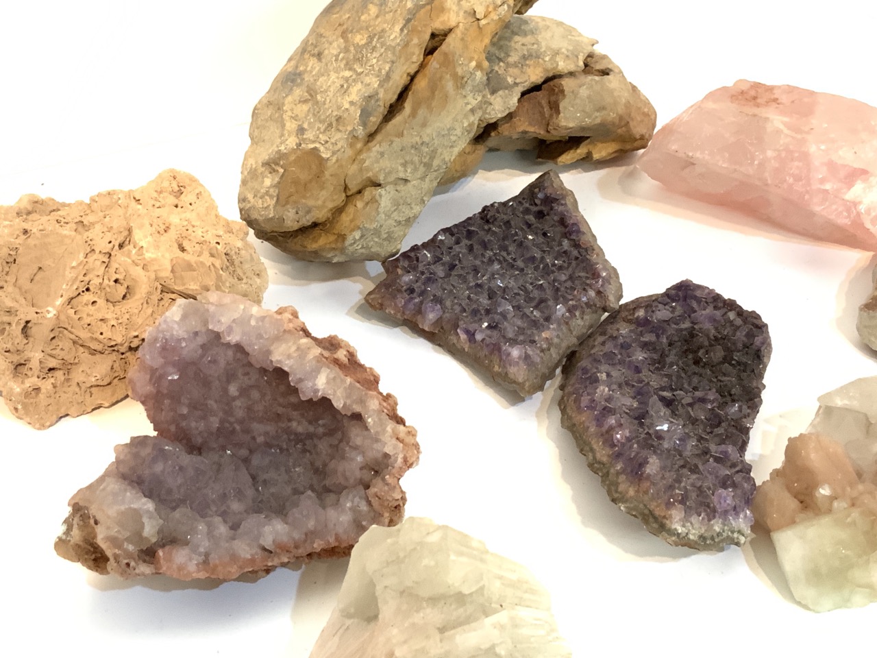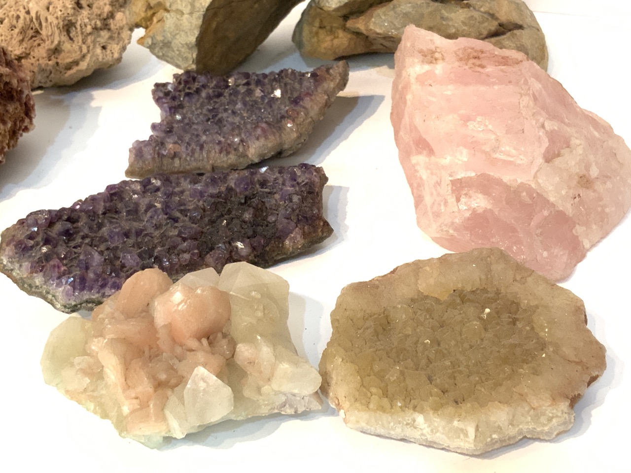 A collection of rock specimens, geodes and stones including pink quartz, amethyst.