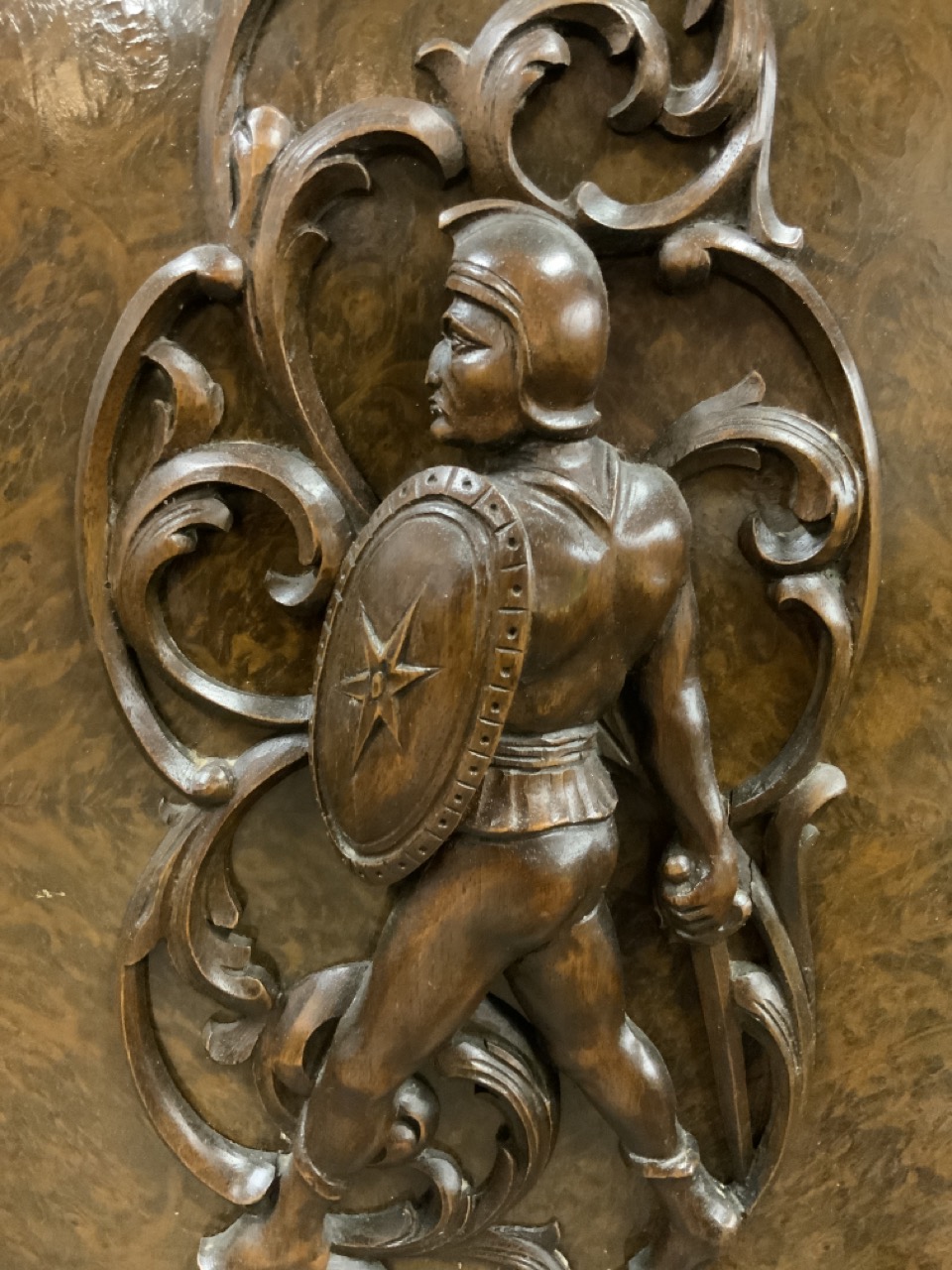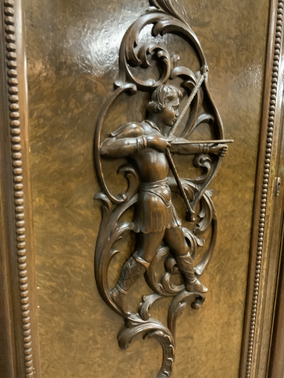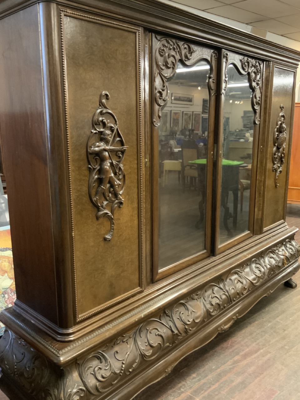 German Baroque style oversized cabinet. Two side doors with men in battle carvings, beveled glass two doors at center and four drawers below.