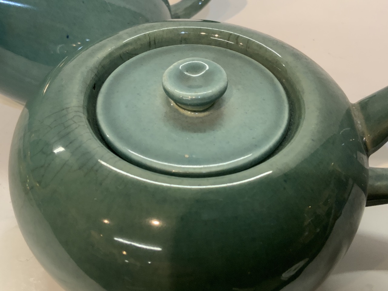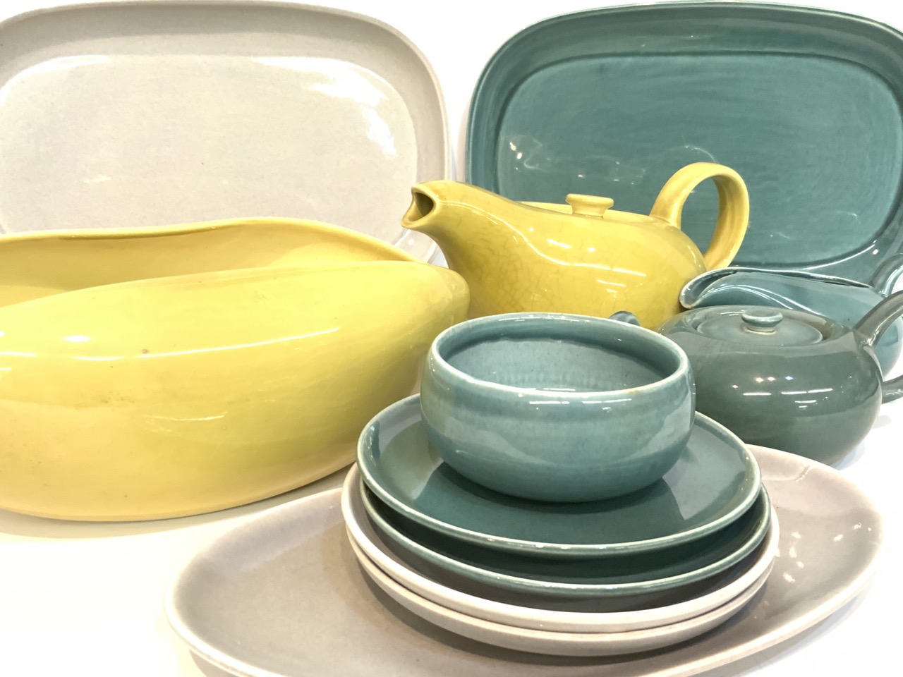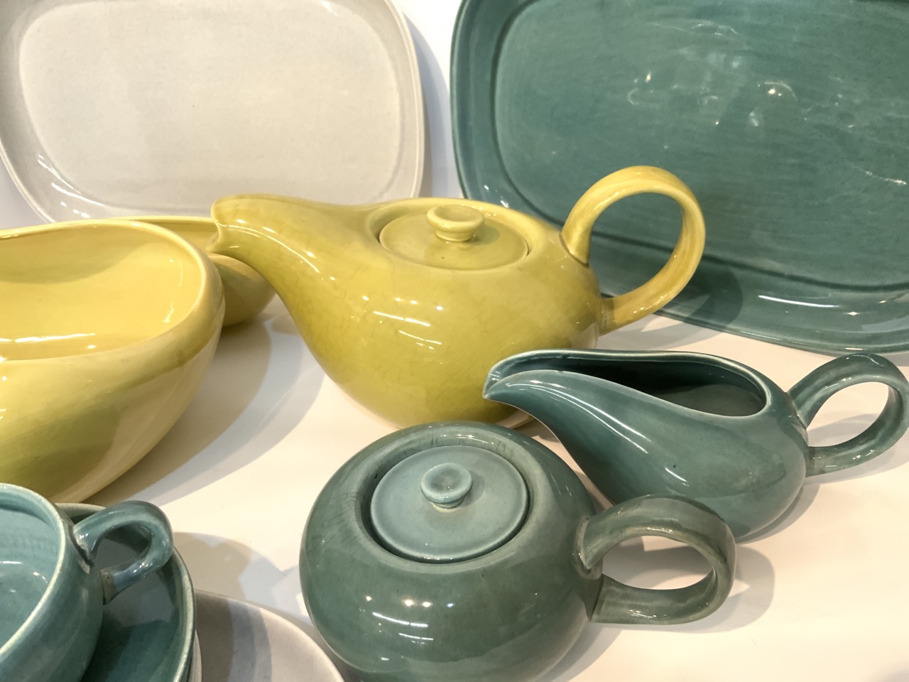 Russell Wright Steubenville china grouping. Teapot, trays, cup and saucer, bowl etc.