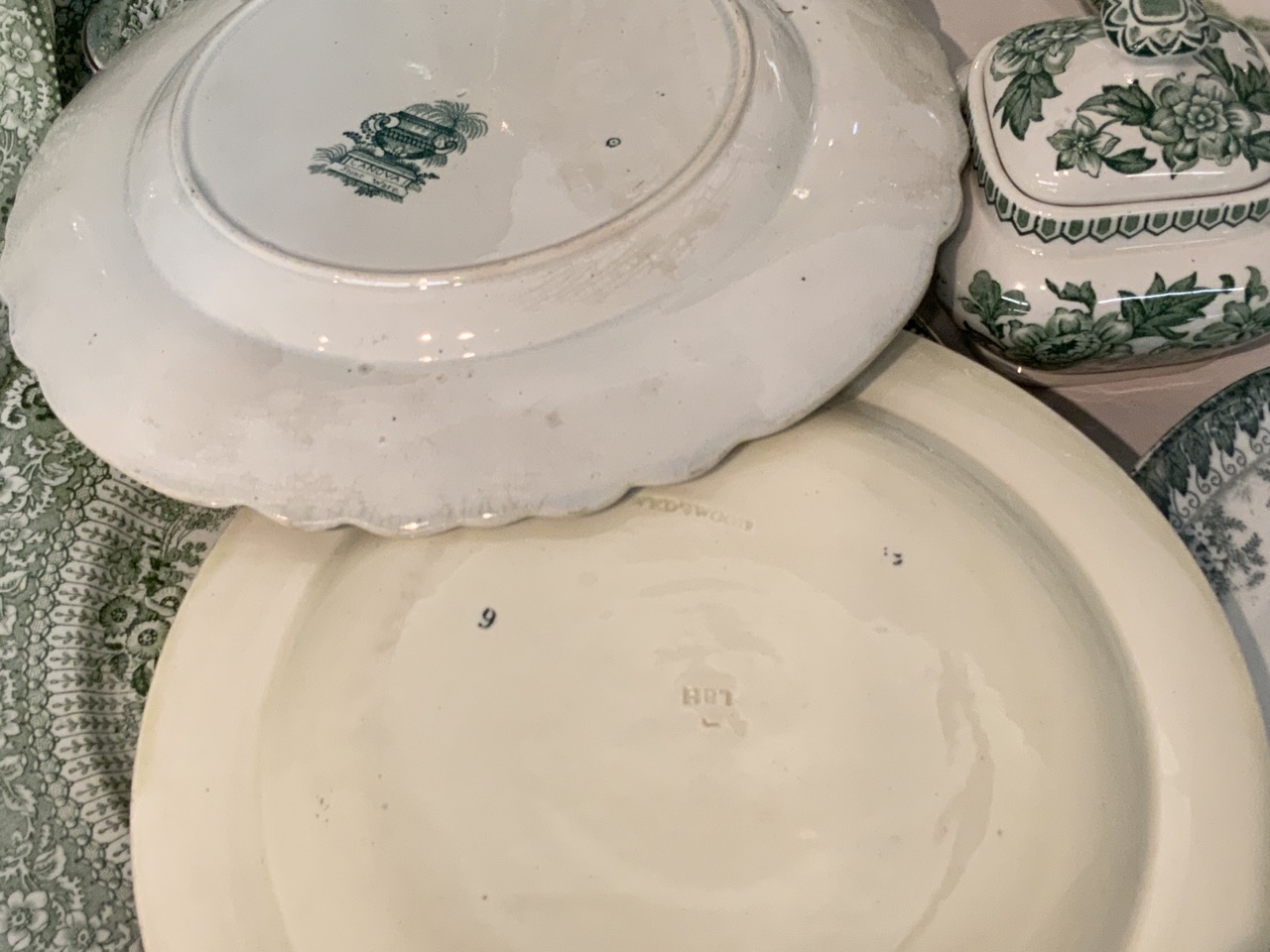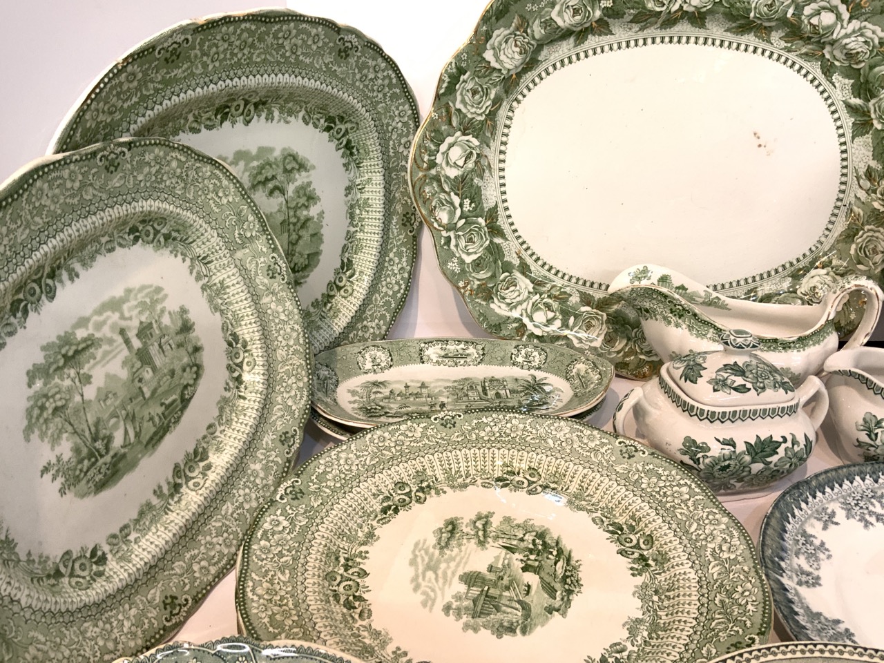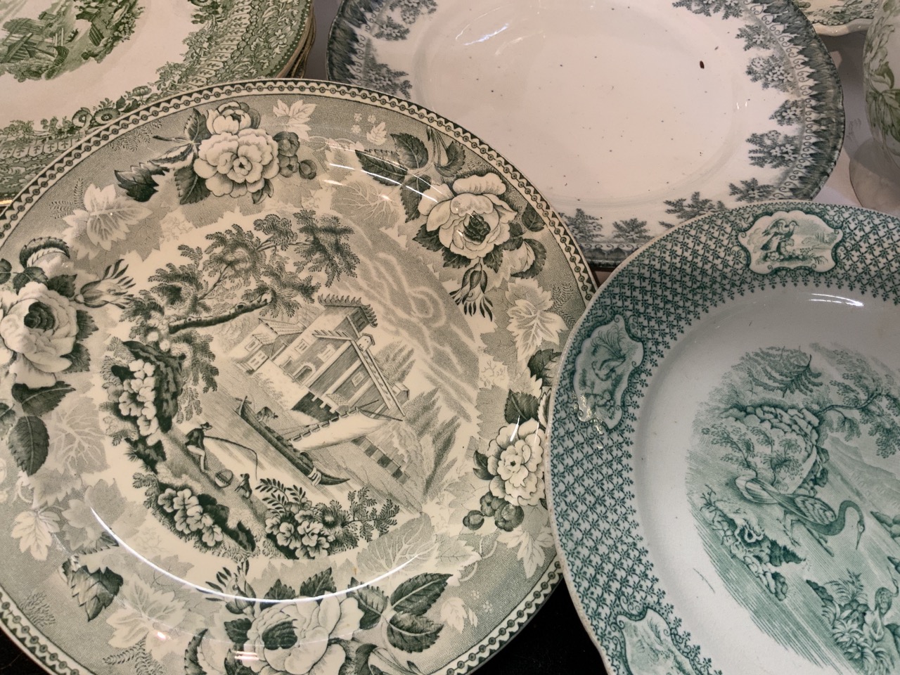 Collection of green and white English transferware. 19th century.. Canova, Adams, Grecian by Ridgeway's, Colonial Pottery, Irving etc.
