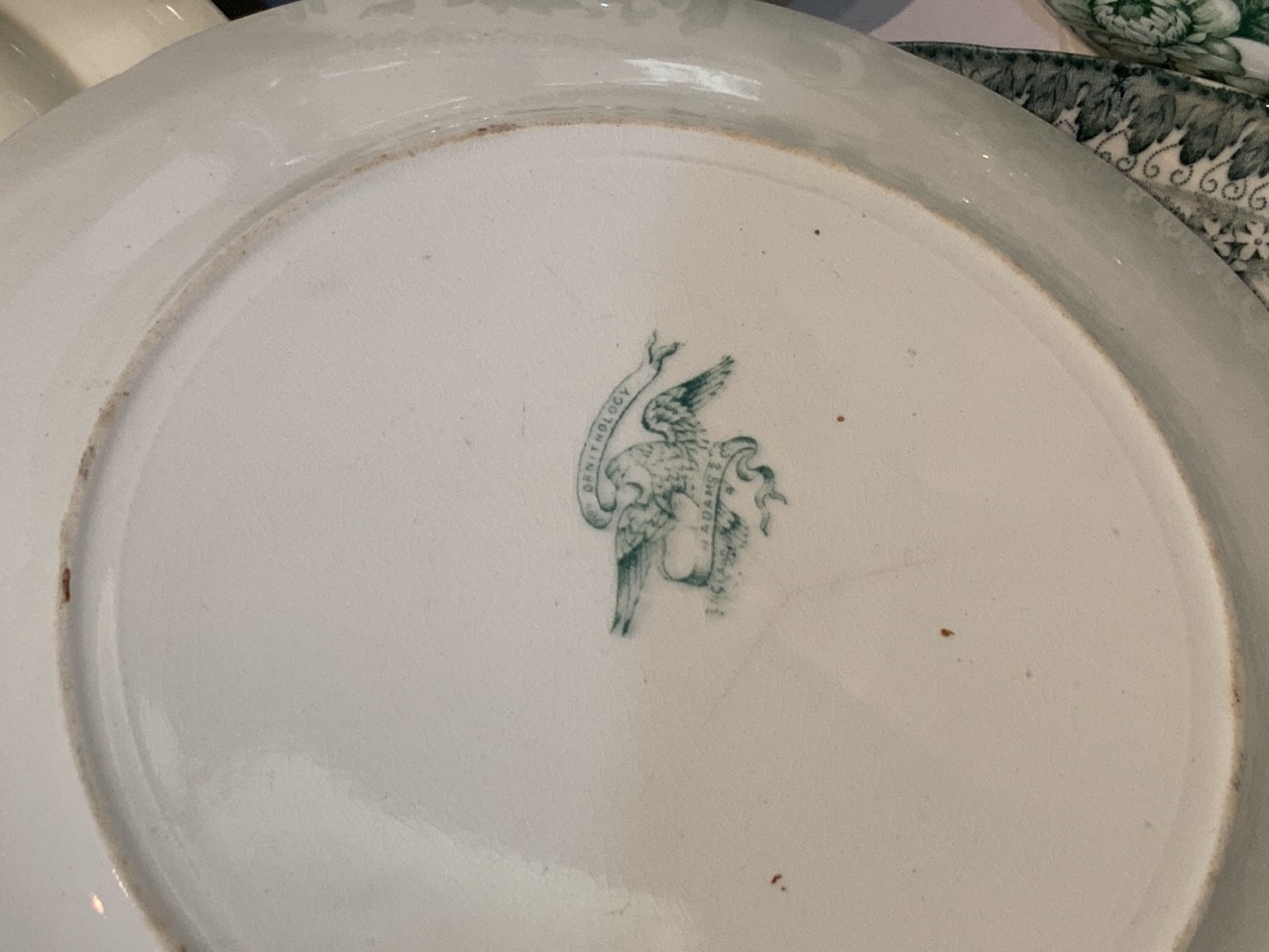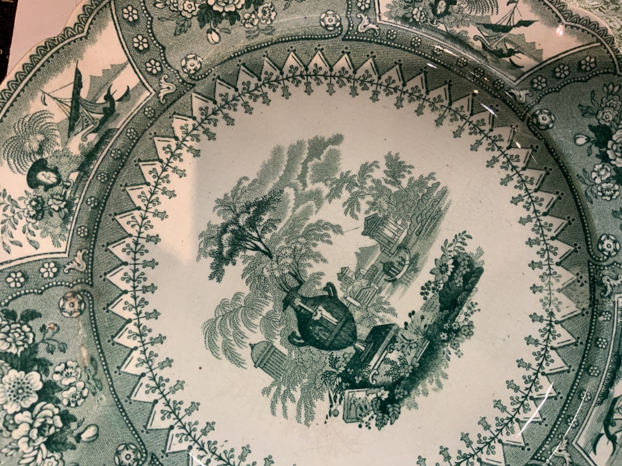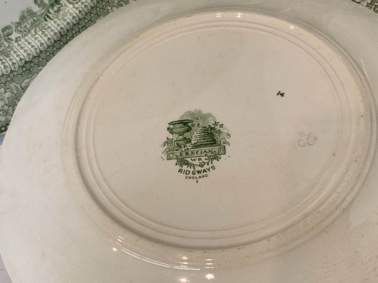 Collection of green and white English transferware. 19th century.. Canova, Adams, Grecian by Ridgeway's, Colonial Pottery, Irving etc.