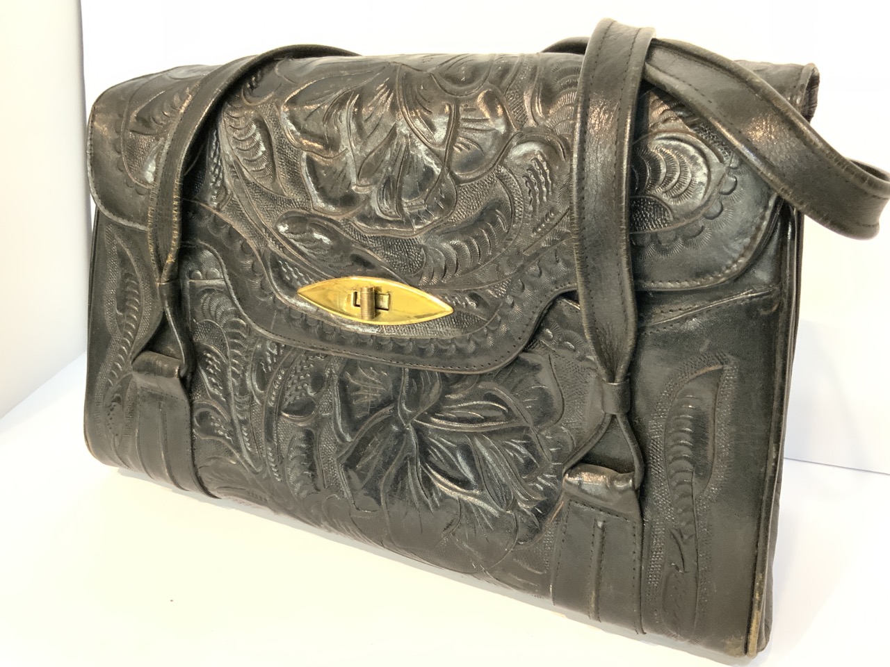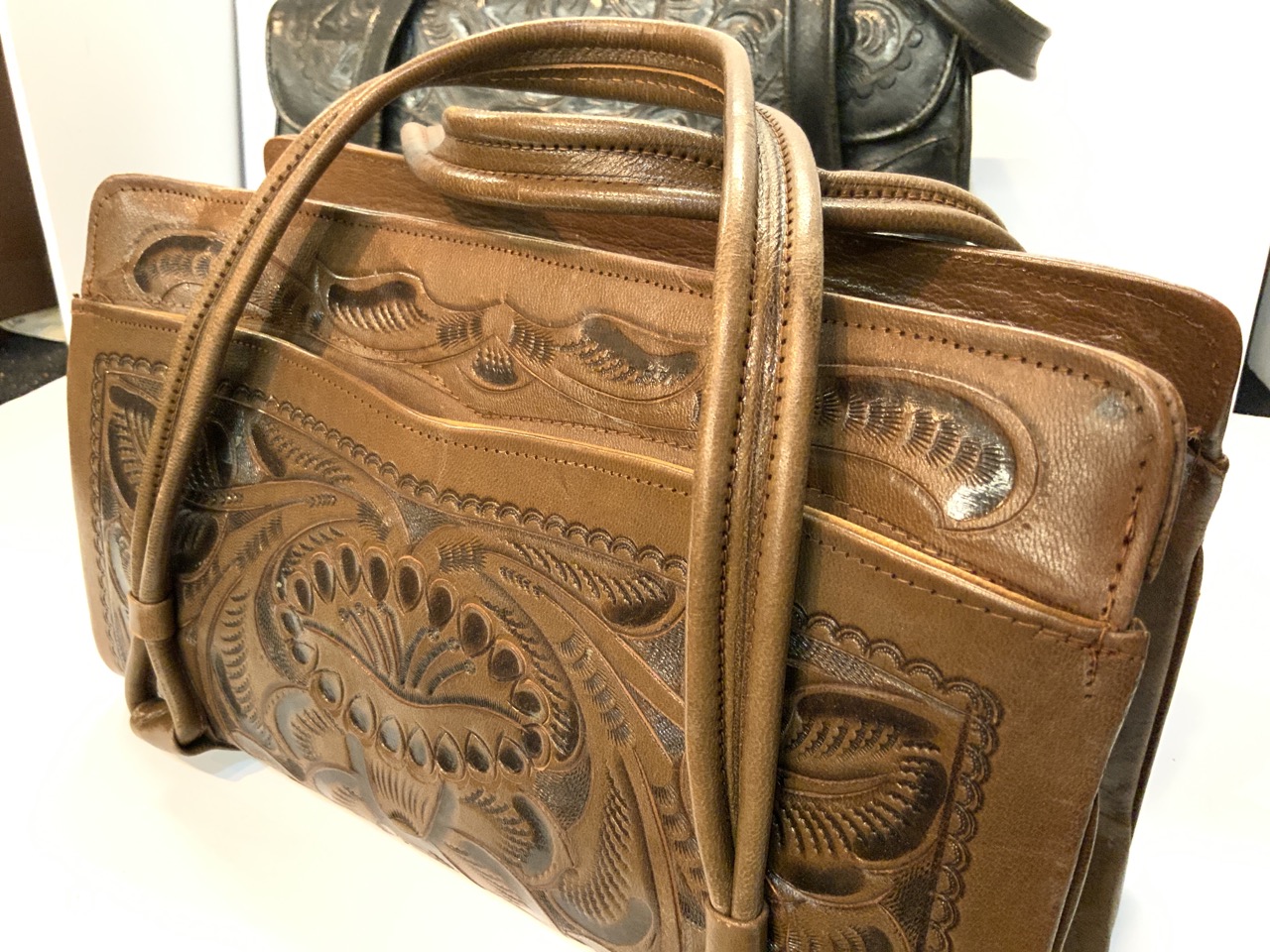 Two (2) 1960's vintage tooled leather handbags. Mexico.