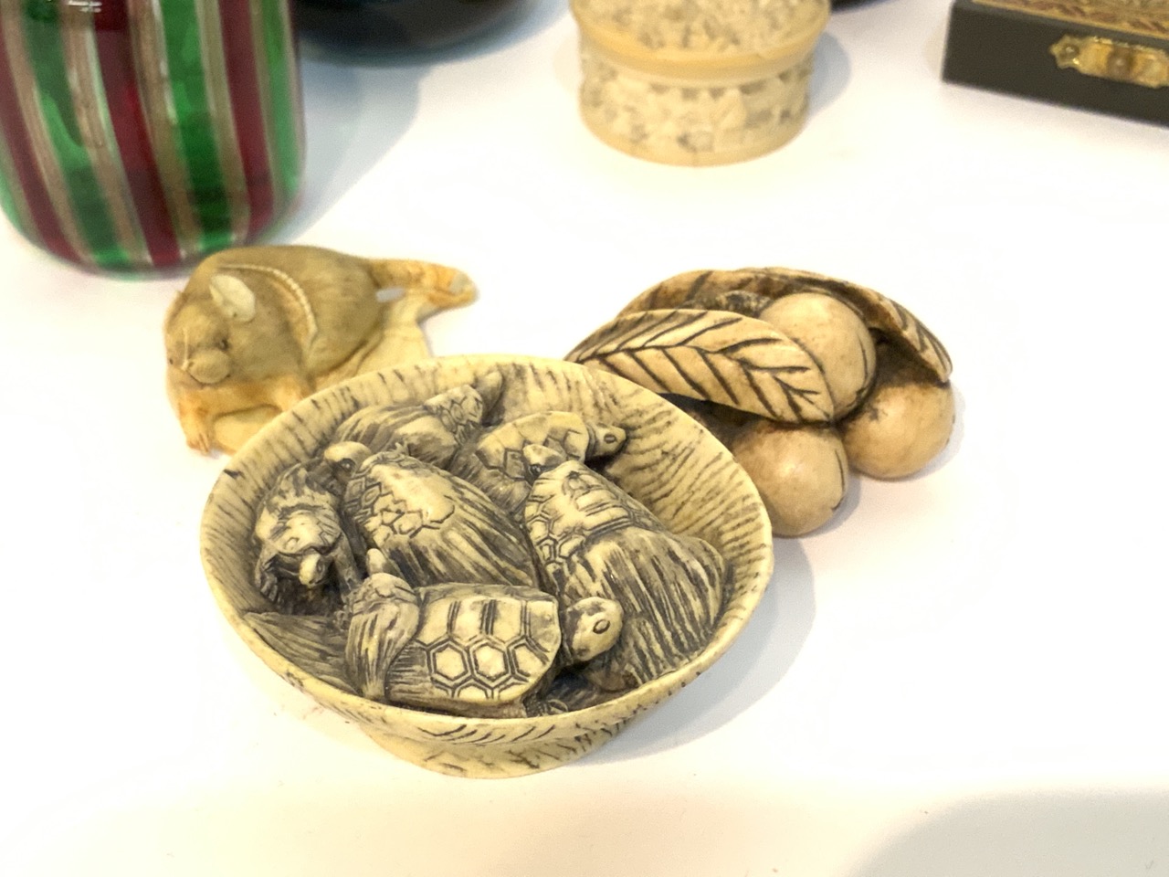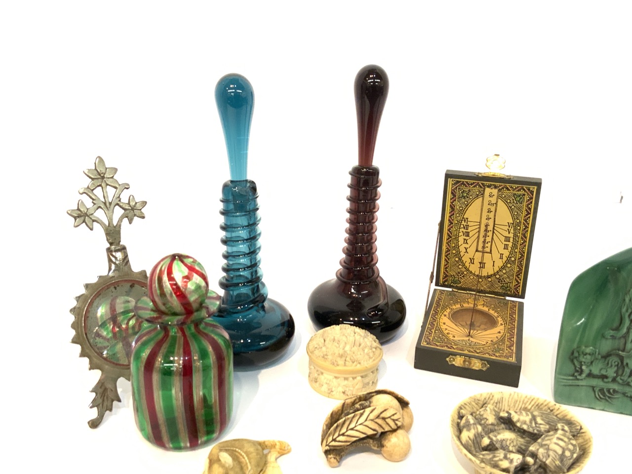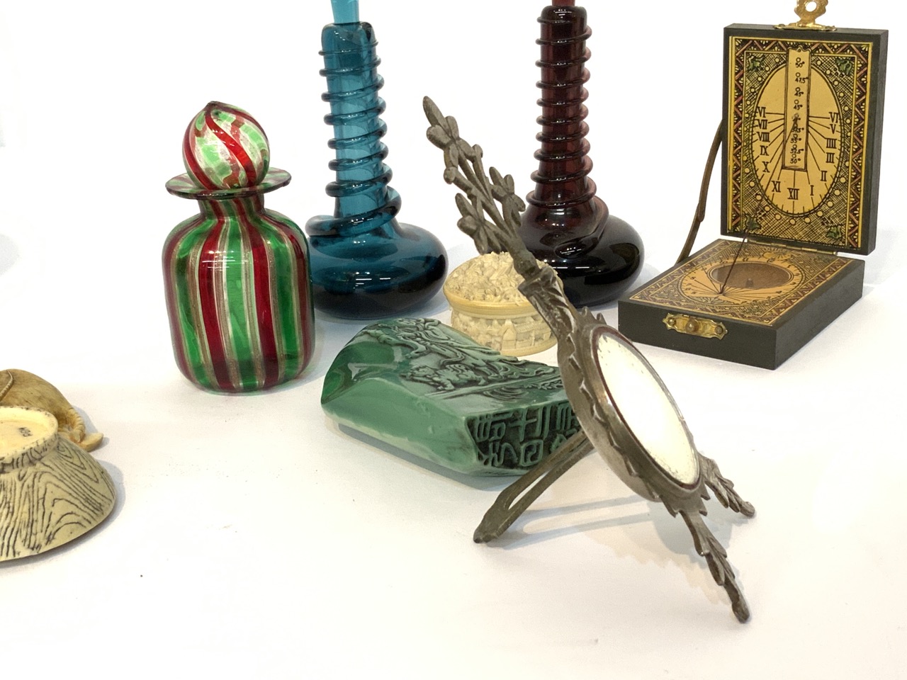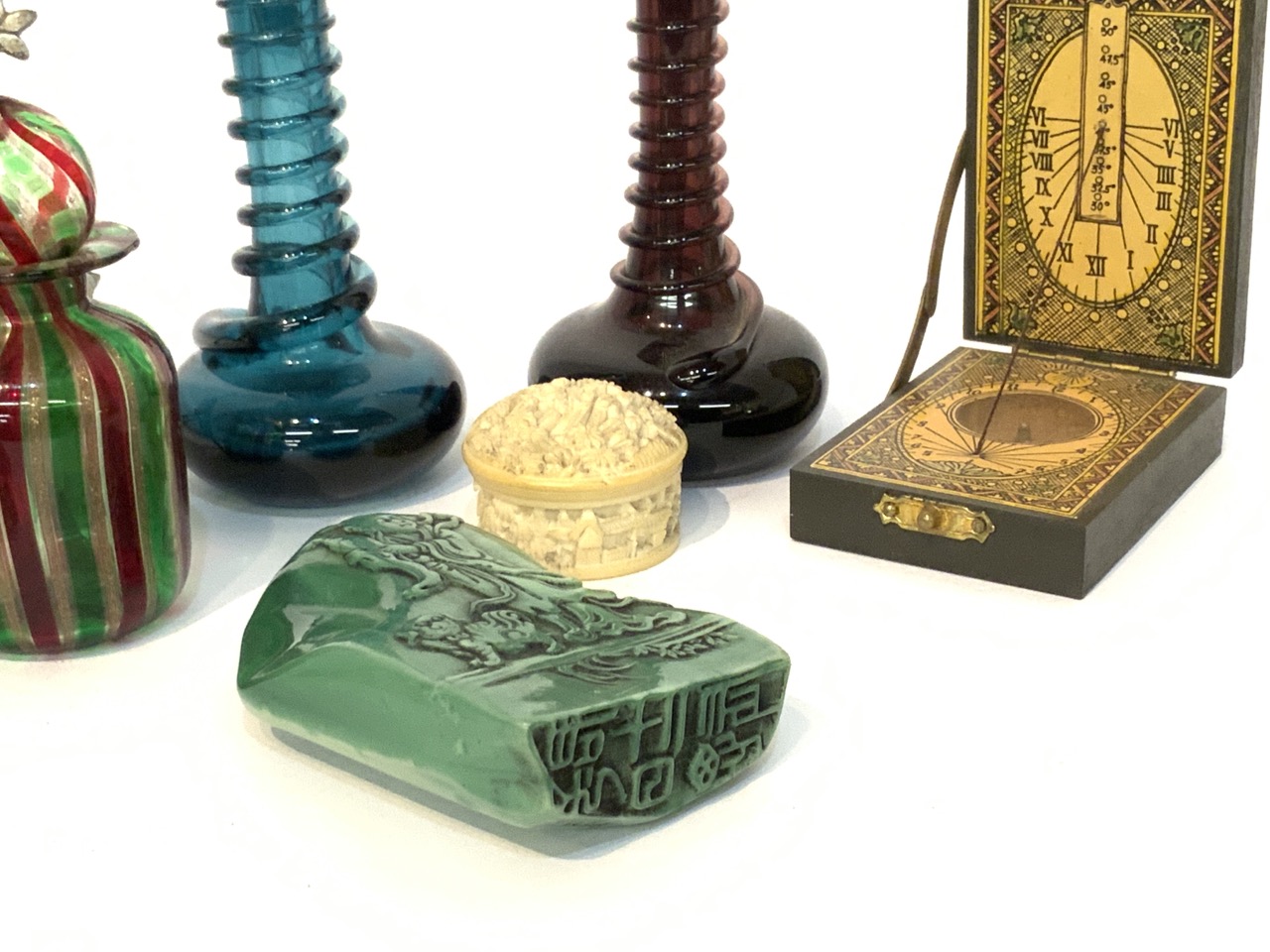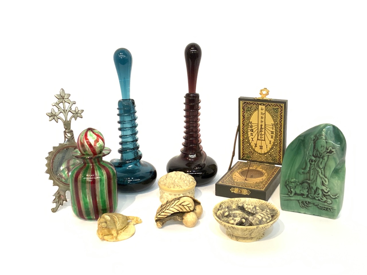 Ten (10) piece estate compiled curiosity lot including Netsuke, Chinese seal, perfume bottles etc.